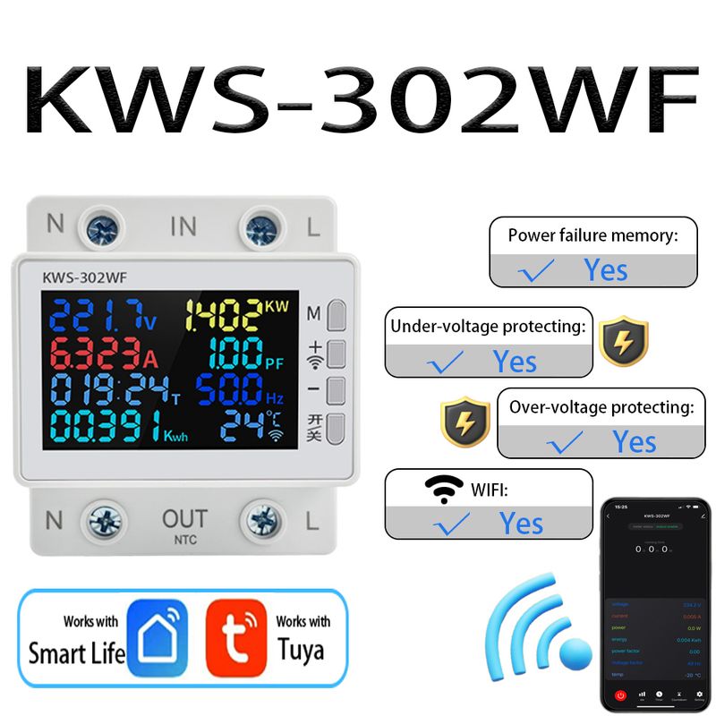 Tuya WiFi 8in1 Power Meter 2P AC Energy Meter APP Control 170-270V/63A Voltage and Current Meter Electricity Meter Smart Life