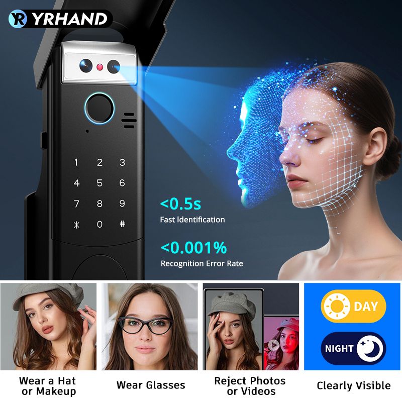 Unlock modes: Face Recognition(V8)/ Fingerprint /Password /RFID Card / APP/ Mechanical Key