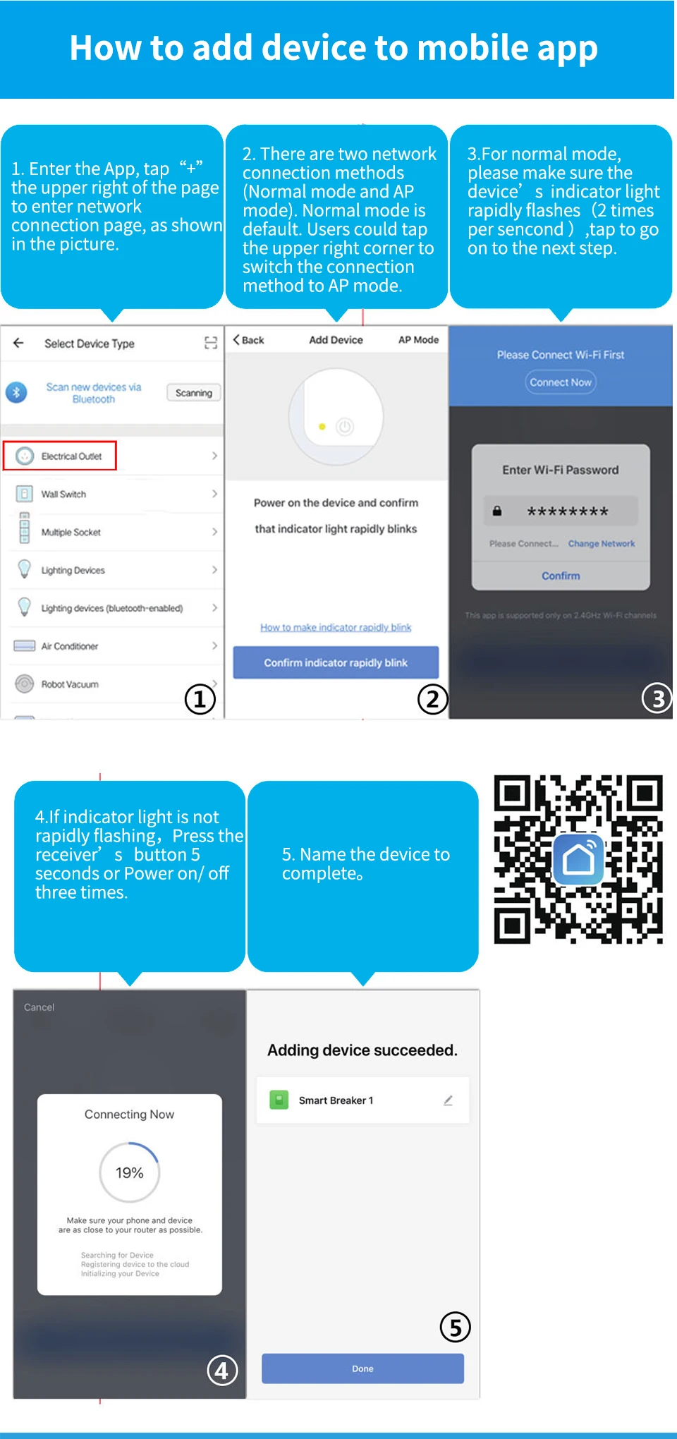 4. If the indicator light of the smart switch is not flashing red light, please press the button of the smart switch and keep it for more than 5 seconds until the red light flashes continuously, then open the APP and connect to the WiFi according to the manual.