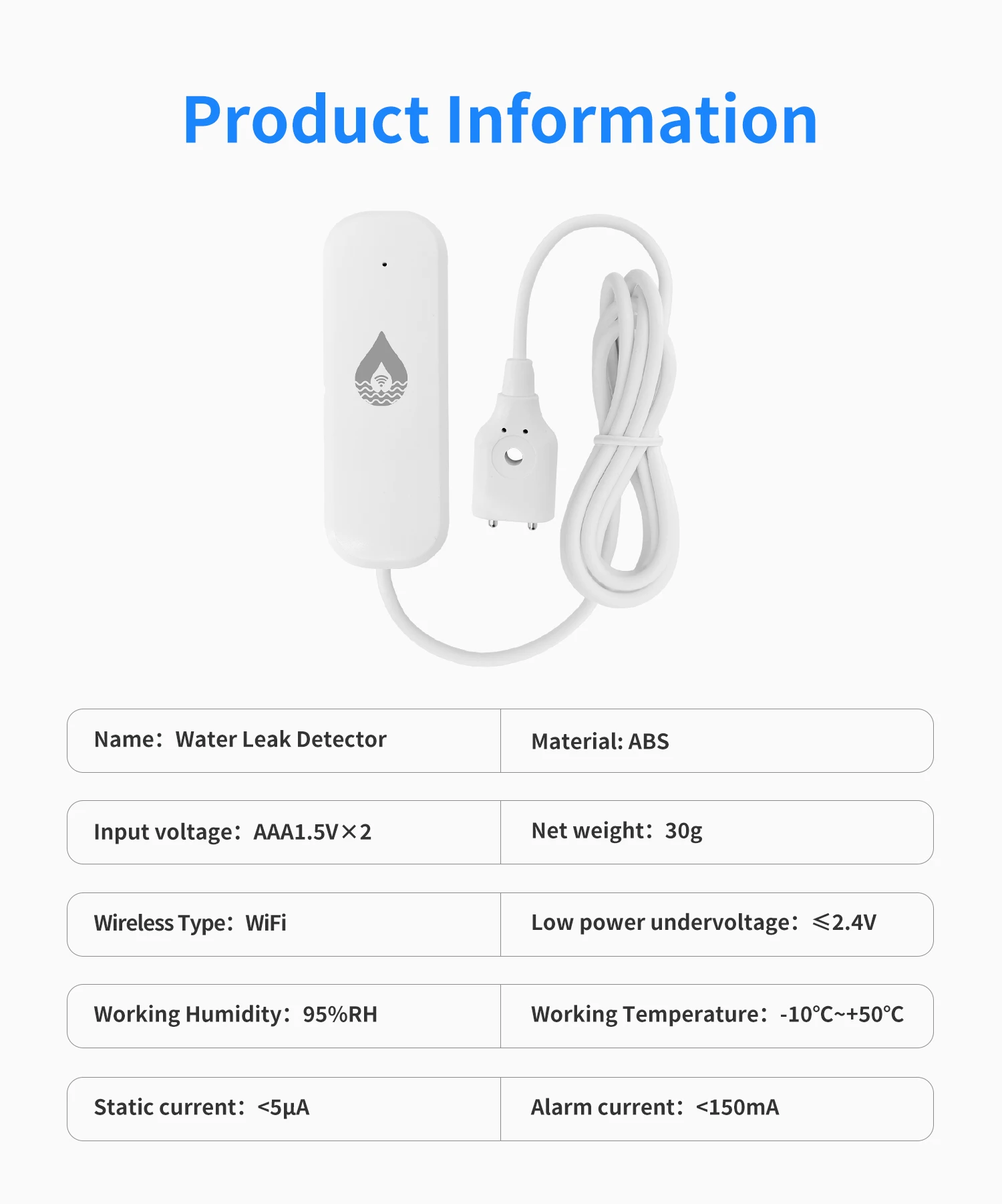 ●Easy Installation:Designed for user-friendly use, this smart water sensor is easy to install, making it the perfect addition to any smart home
