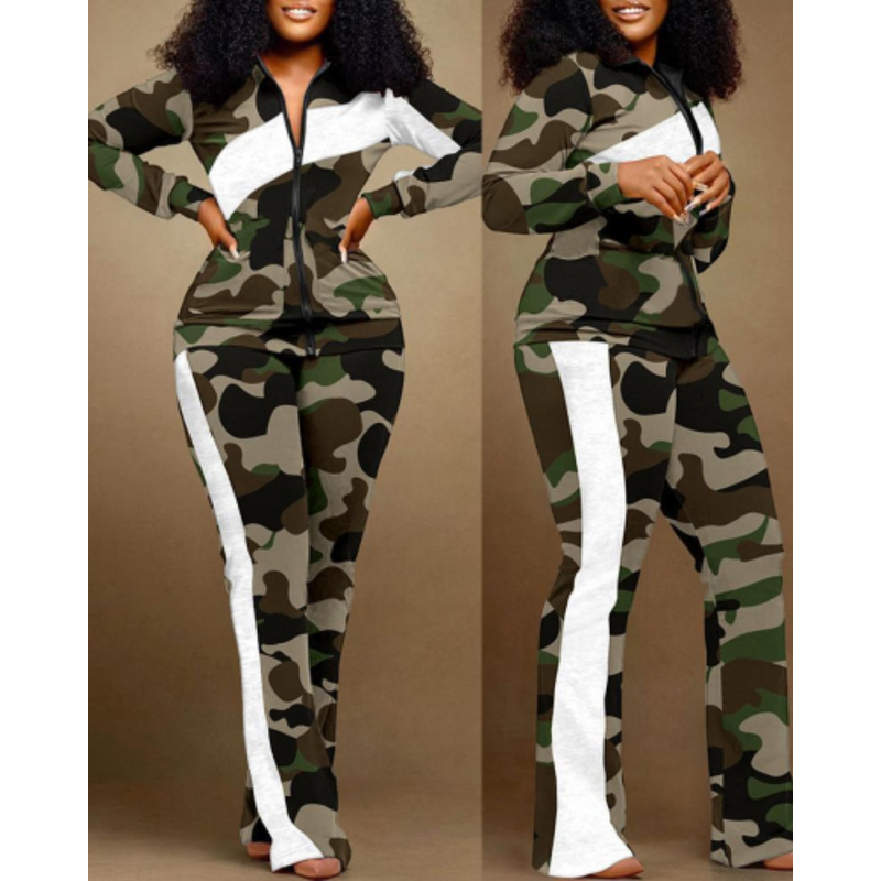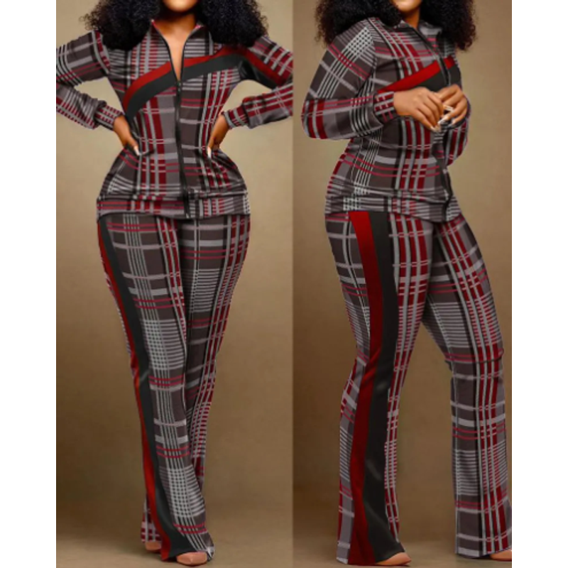 Two Piece Set Women Outfit 2023 Autumn Fashion Geometric Print Stand Collar Long Sleeve Zip Up Top & Casual Sporty Pants Set