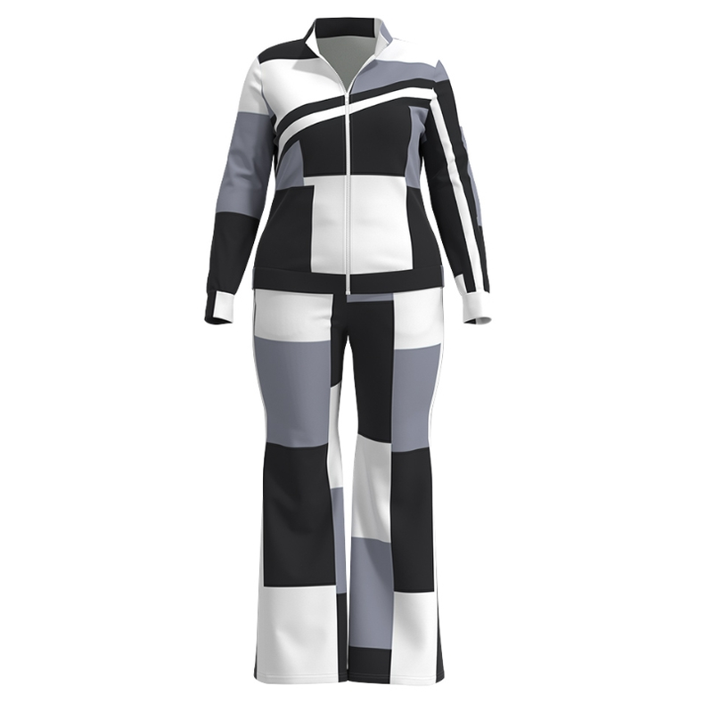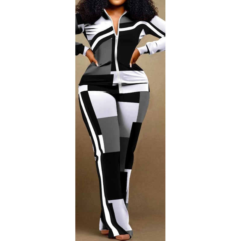 Two Piece Set Women Outfit 2023 Autumn Fashion Geometric Print Stand Collar Long Sleeve Zip Up Top & Casual Sporty Pants Set