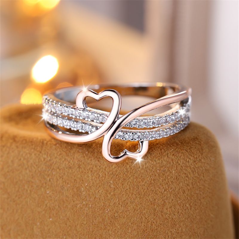 Two Tone Rose Gold Silver Color Double Heart Rings For Women White Zircon Ins Infinity Wedding Bands Bridal Engagement Jewelry