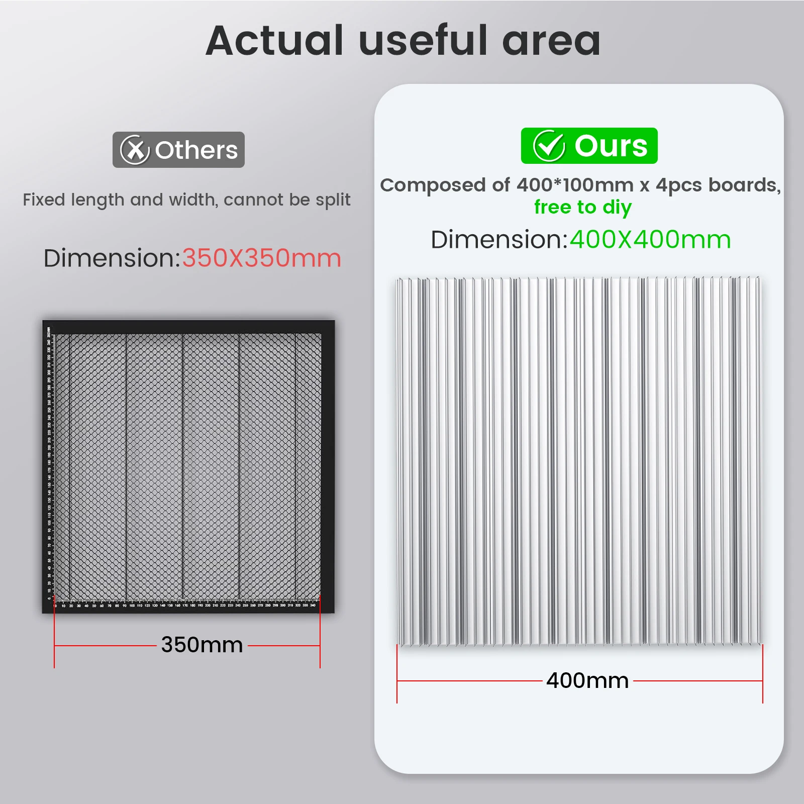 Each small honeycomb panel measures 400x100 mm, and four panels can be combined to form a complete 400x400mm honeycomb panel. This modular design allows you to replace only the worn parts, saving money in the long run.Pay attention to the size