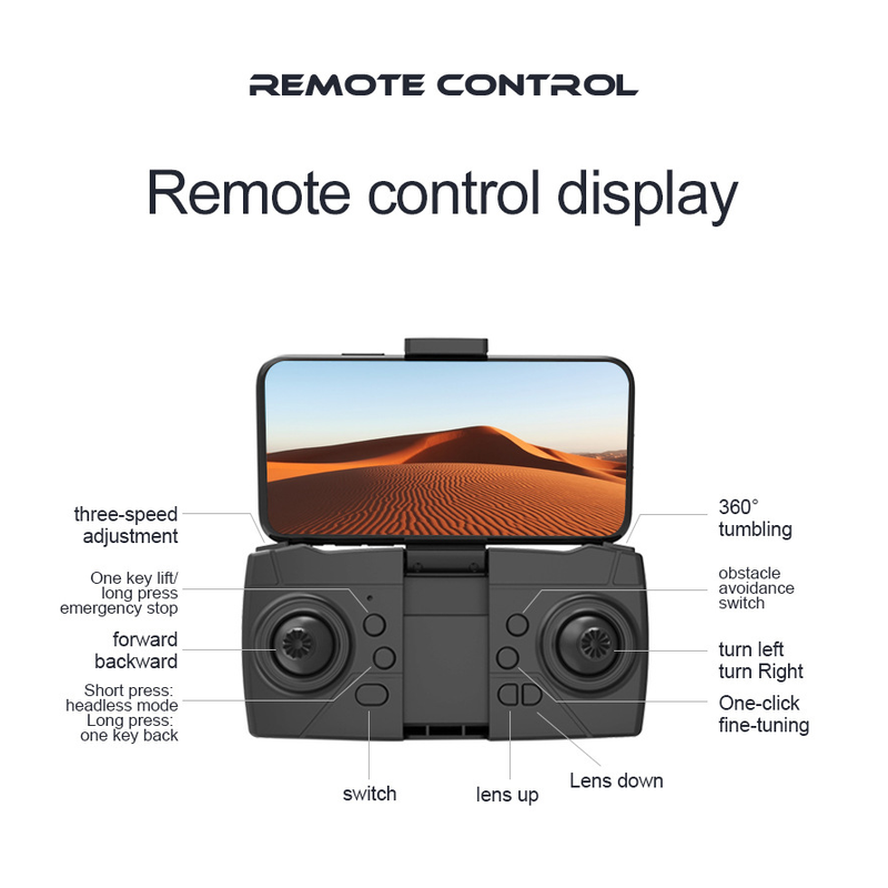 Features: four-sided obstacle avoidance, one-click return, low battery return, no signal return, one-click rolling, optical flow hover, electric adjustment steering lens
