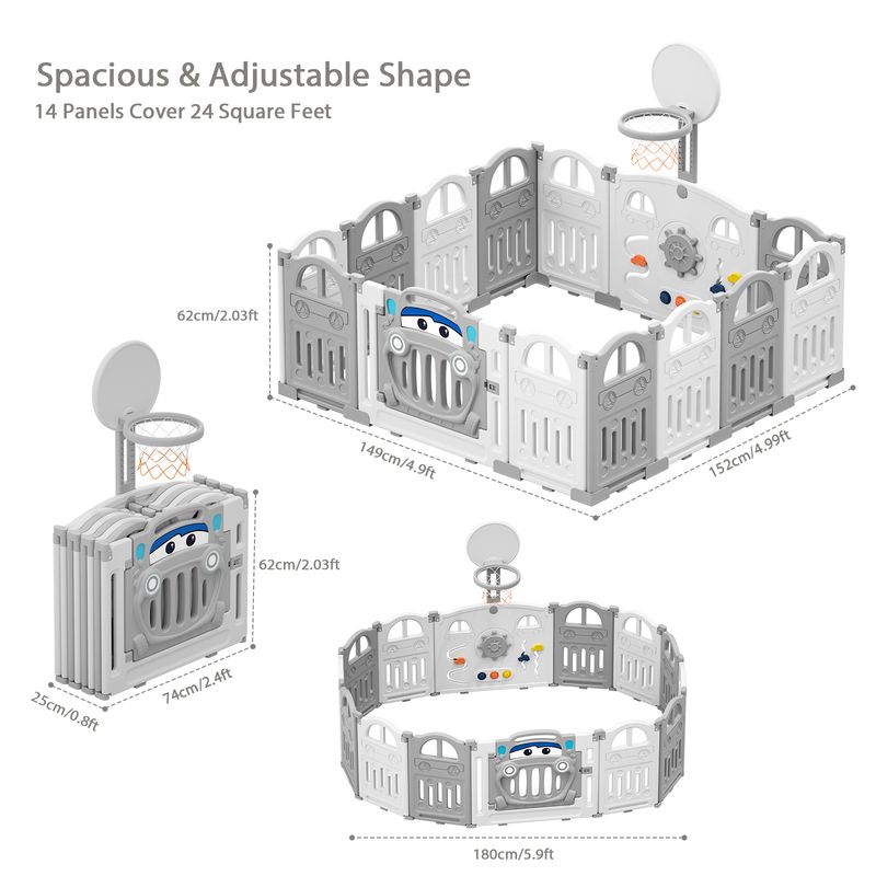 Foldable Baby Playpen with Basketball Hoop & 50Pcs Coloured Pit Balls without Play Mat, Toddler and Baby Playpen fence, 14-Panel Features: