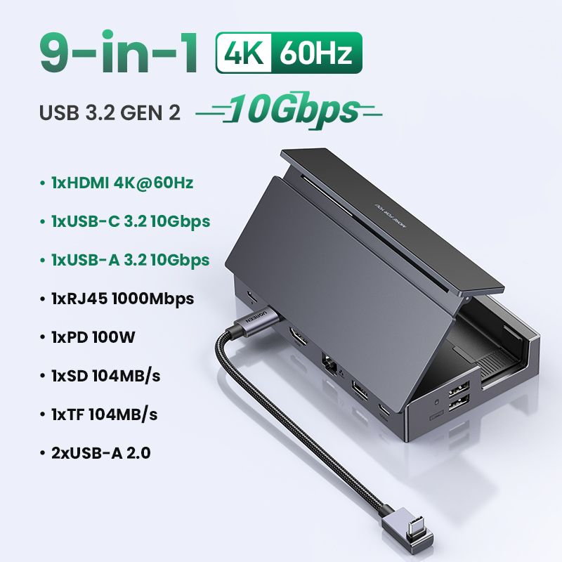2. 9-in-1 4K60Hz 10Gbps: HDMI(4K@60Hz) + RJ45 1000Mbps + PD 100W Charge + 1xUSB-A 3.2 Gen2 10Gbps + 1xUSB-C 3.2 Gen2 10Gbps + SD&TF 104MB/s + 2xUSB-A 2.0.
