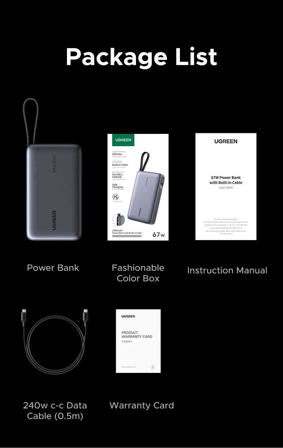 UGREEN 67W 20000mAh Power Bank Built-in Type-C Cable, PD3.0 65W Laptop Charger, Compatible for Xiaomi 67W External Battery