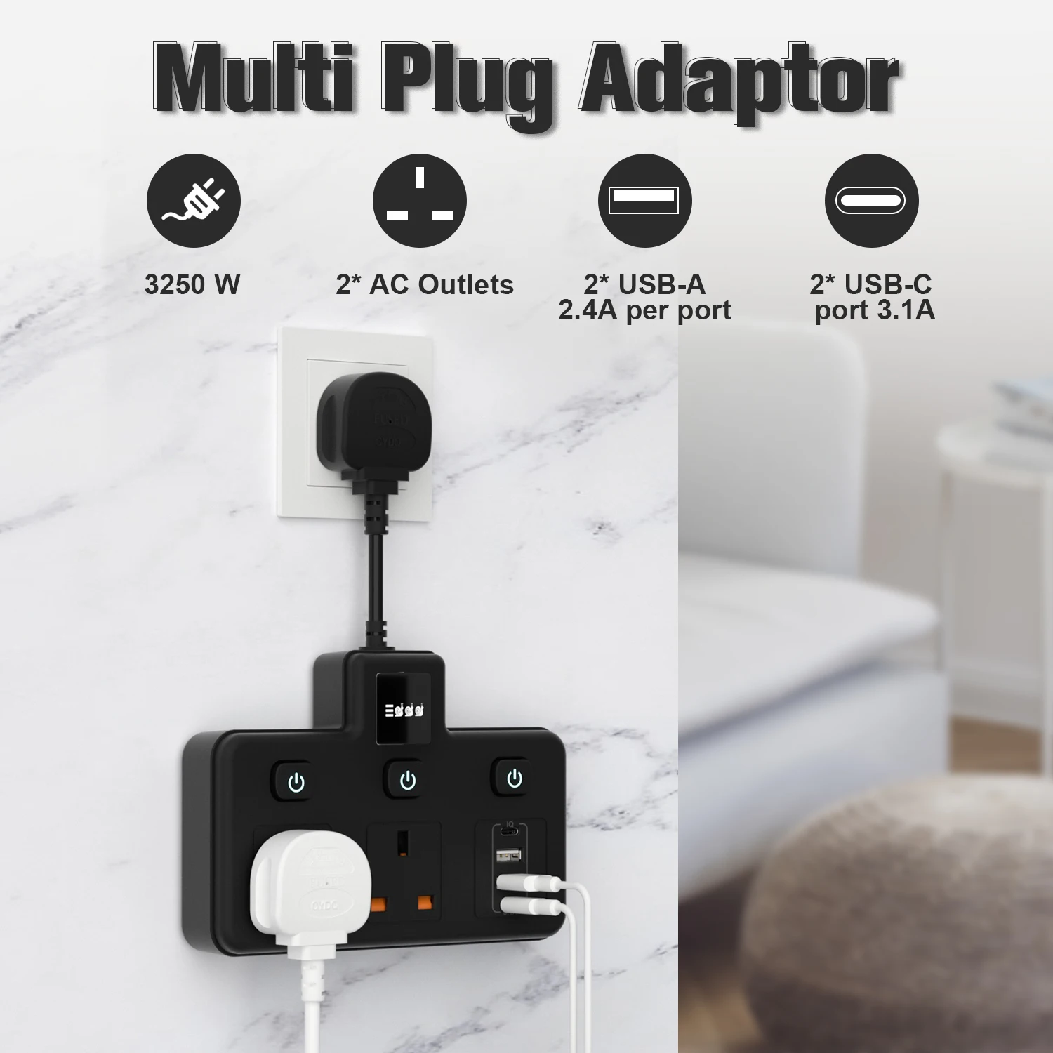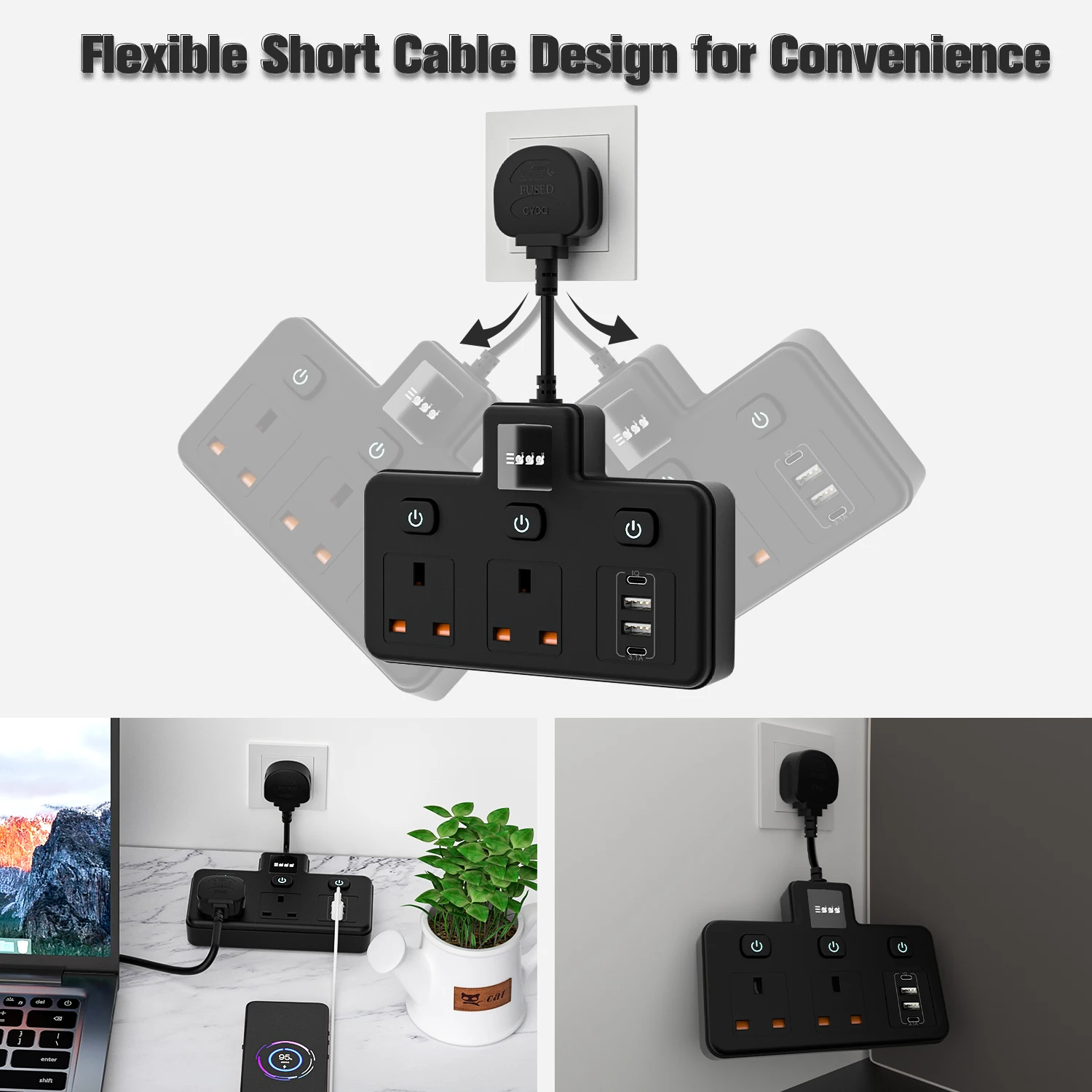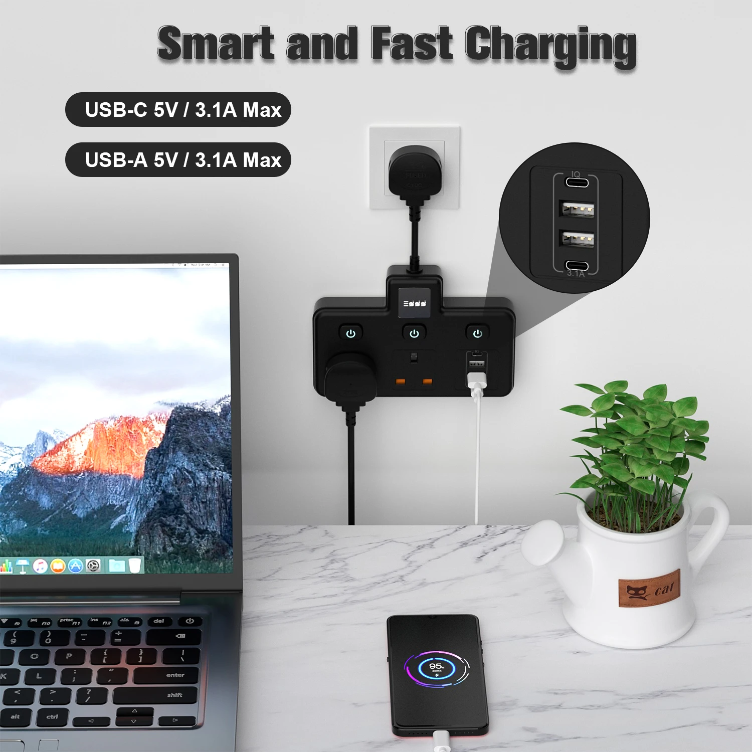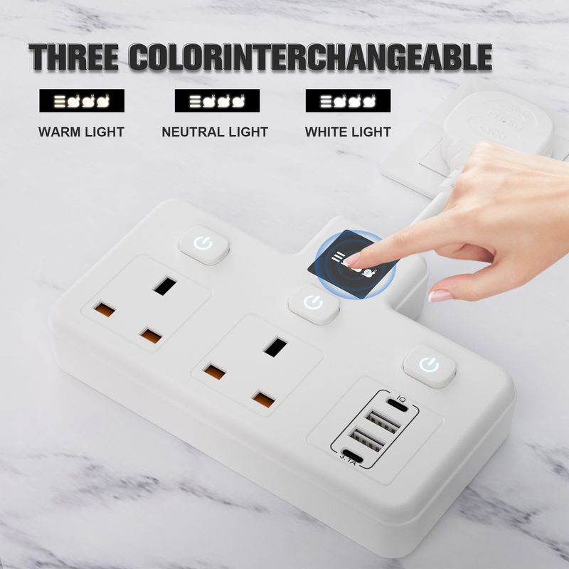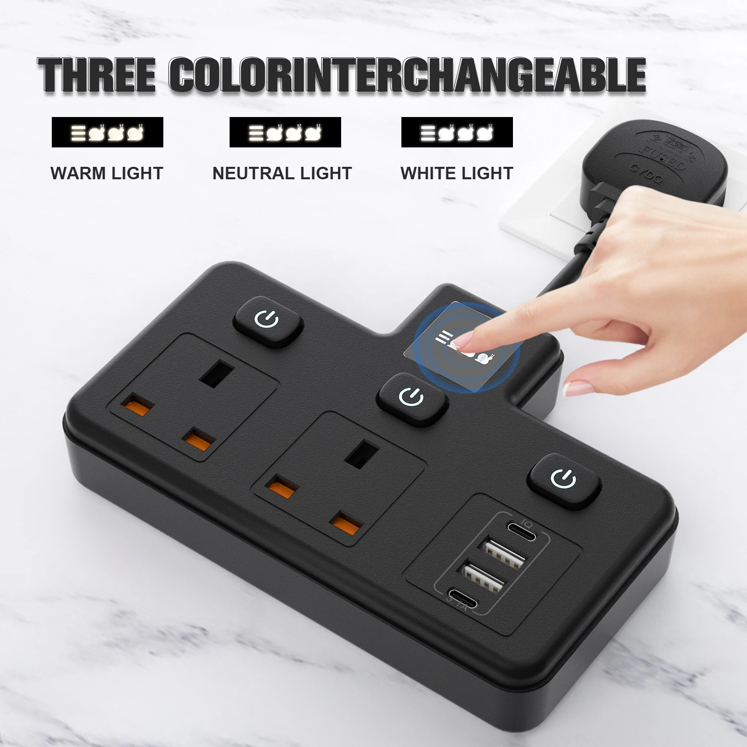 UK Multi Plug Power Strip Extension with Individual Switch, Electrical Outlet 2 USB-A 2 USB-C Slots with Adjustable Night Light