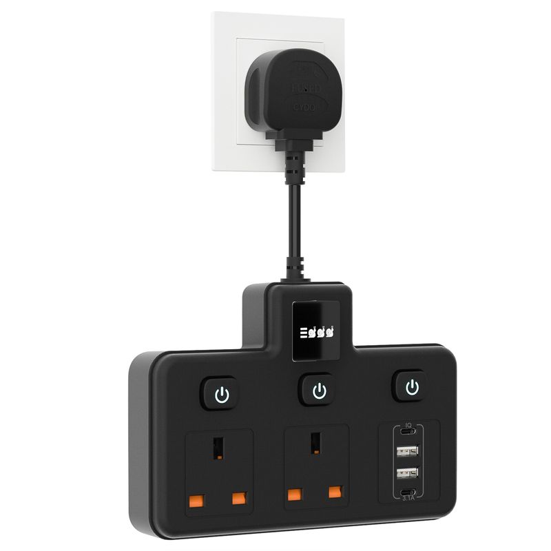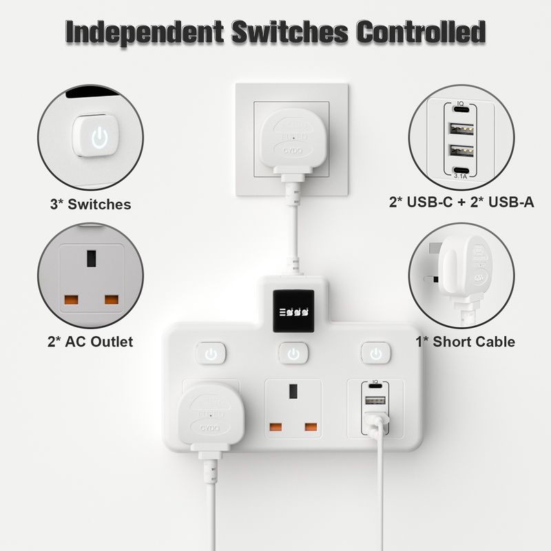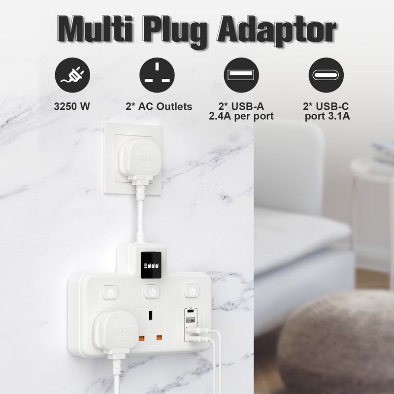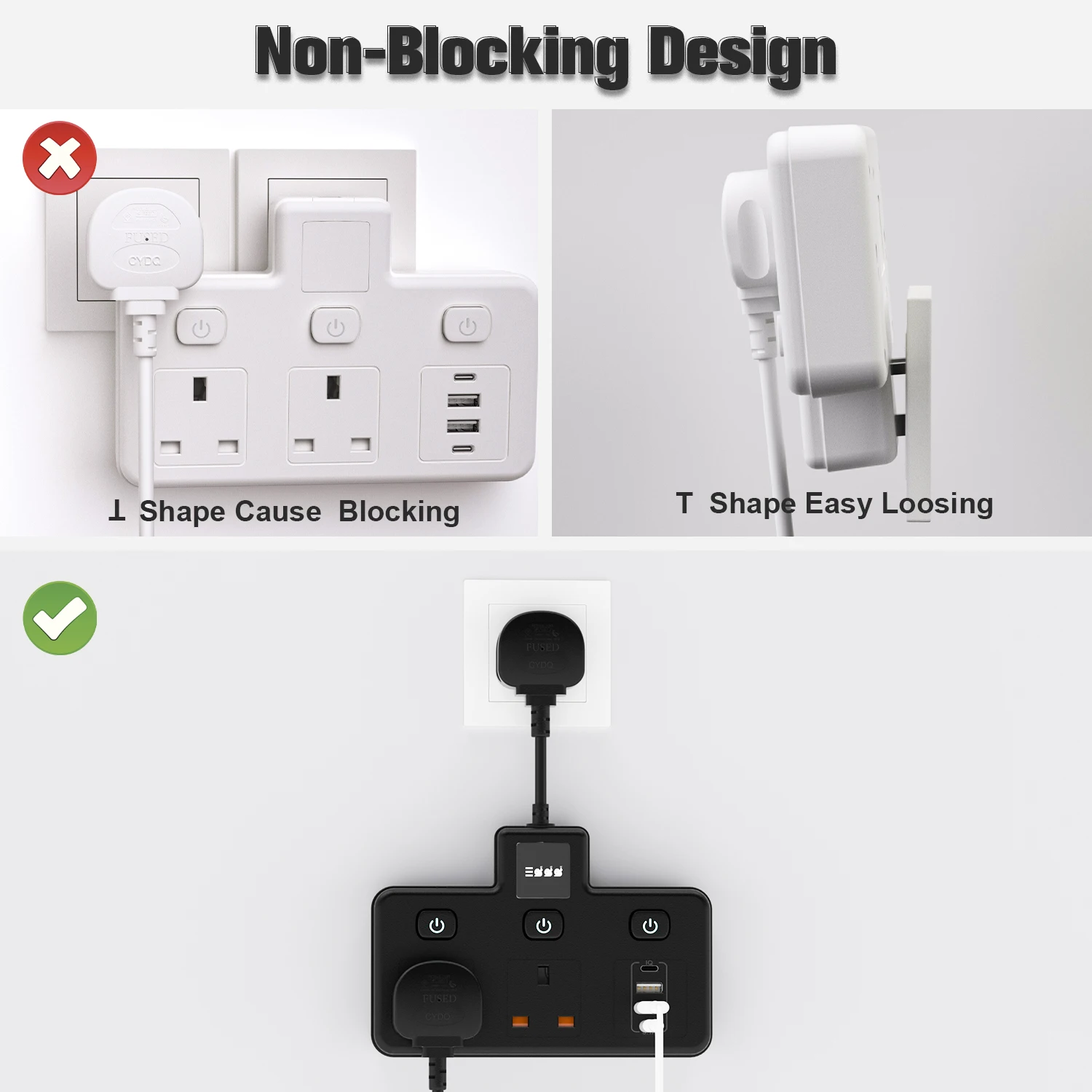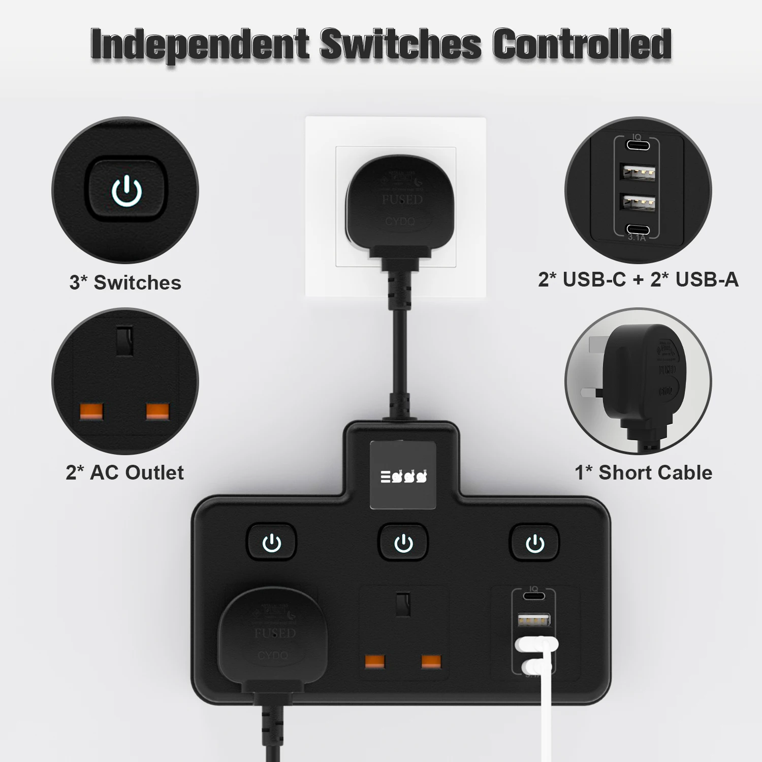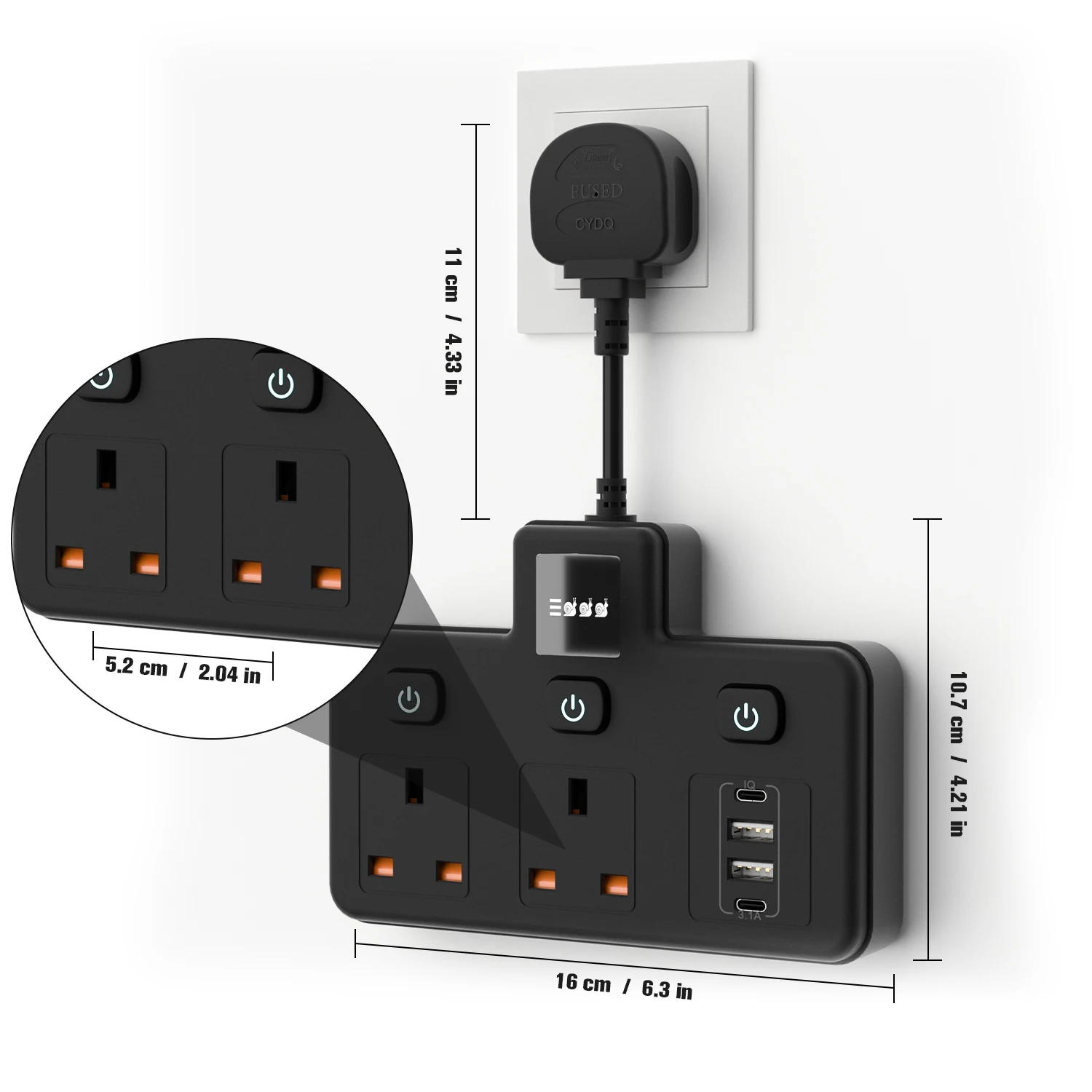 UK Multi Plug Power Strip Extension with Individual Switch, Electrical Outlet 2 USB-A 2 USB-C Slots with Adjustable Night Light