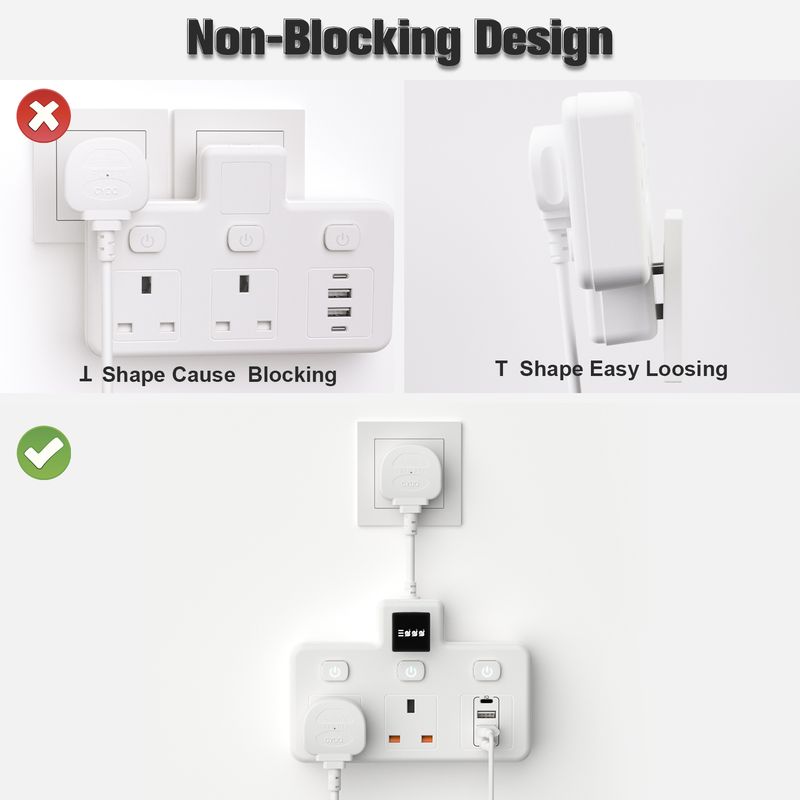 1. 【 Non-blocking Design 】Save space with a scientifically rational design for short plug sockets that won't interfere with adjacent sockets or switches. Perfectly adapts to the compact socket layout of any room.