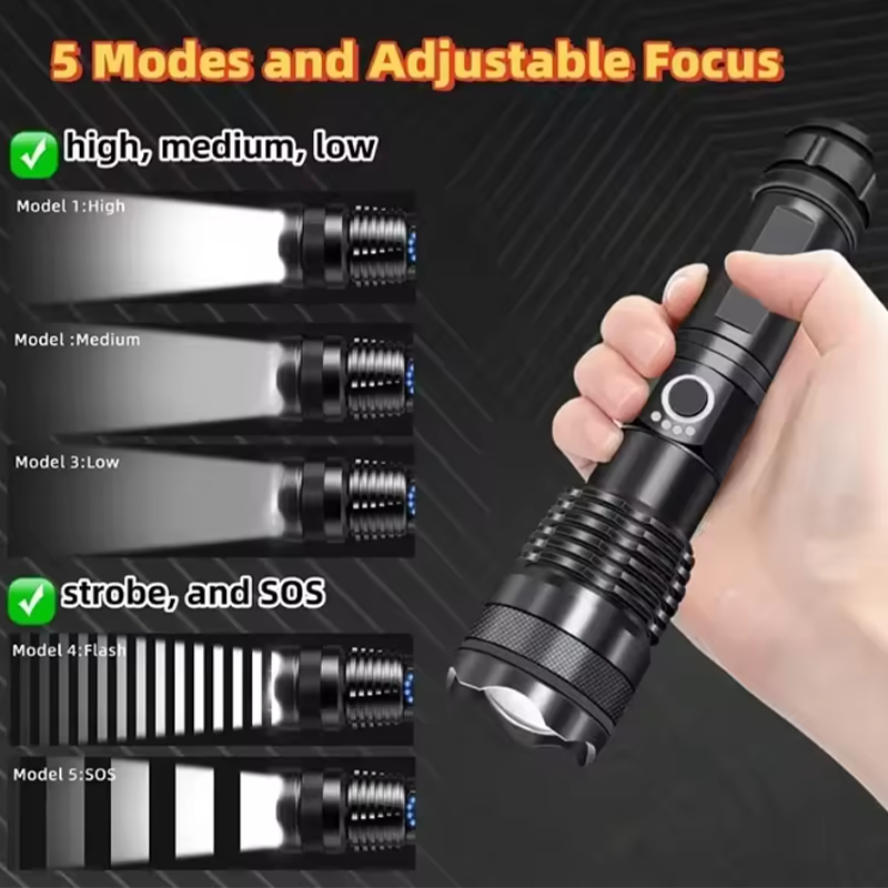 Ultra-high Power Rechargeable Tactical Flashlight Zoomable Aluminum Alloy Torch Outdoor Camping Fishing Hunting Emergency Gear
