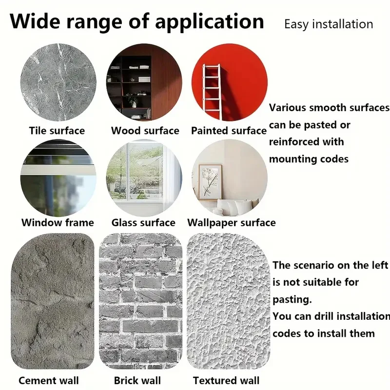 【Precautions for use】:Can only be used on smooth surfaces such as cabinet boards, tiles, glass, smooth walls, not suitable for rough surfaces, powder walls. The self-adhesive curtain track is cut open and shipped if it exceeds 50cm. We will provide connectors to connect them together without affecting their use. Please refer to the product link SKU image
