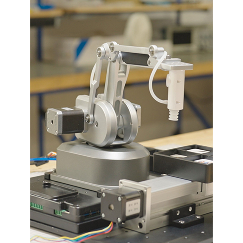 ultraArm is a small desktop robotic arm. It is designed with classic metal structure and occupies only an area of A5 paper. It is equipped with high-performance stepper motors, and it owns ±0.1mm repeated positioning accuracy and high stability. UltraArm can achieve the precise writing and drawing, laser engraving, and can be freely matched with multiple accessories such as slide rail, conveyor belt, myAGV and cameras. It can complete different practical training projects according to different needs, and is widely used in many fields such as higher education, scientific research, vocational application education, etc.