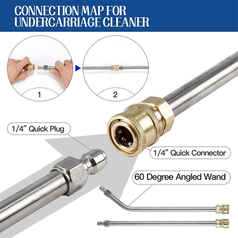 [Easy-to-install car under washer] Pressure washer undercarriage cleaner is 1/4" male plug for quick connect and release. Washer cleaner works when connects to pressure washer extension wand. It will be more convenience if you connect pivoting coupler between undercarraige cleaner and wand.