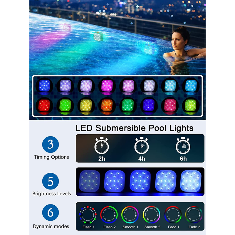 ใ๐๐ ๐๐ฎ๐ฌ๐ญ๐จ๐ฆ๐๐ซ๐ข๐ณ๐๐ ๐๐จ๐ฅ๐จ๐ซ๐ฌ+๐ ๐๐ซ๐ข๐ ๐ก๐ญ๐ง๐๐ฌ๐ฌ+๐ ๐๐ฒ๐ง๐๐ฆ๐ข๐ ๐๐จ๐๐๐ฌใ--our Pool Light with 13 RGBW LEDs, providing 16 different colors, 5 levels brightness and 6 dynamic modes (FLASH1/2, FADE1/2, SMOOTH1/2) to create the most suitable atmosphere for you and enhance the visual effect of the swimming pool. The submersible led light is suitable for swimming pool, hot tub,underwater inground pool, above ground pools, Bathtub or Fish tank.