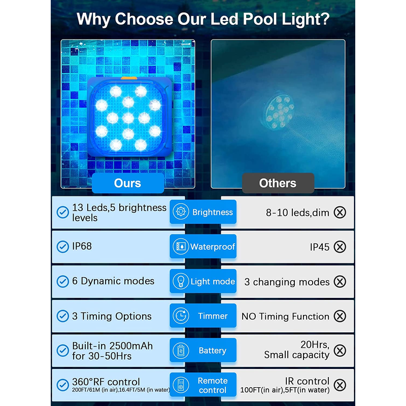 ใ๐๐๐๐ ๐๐๐ญ๐๐ซ๐ฉ๐ซ๐จ๐จ๐ ๐๐จ๐จ๐ฅ ๐๐ข๐ ๐ก๐ญใ--Swimming pool lights with High waterproof performance can effectively avoid safety problems and have a longer service life. IP68 waterproof led pool lights can illuminate the entire swimming pool, making your pools more beautiful and change different colors/ light effects at night. The submersible led lights create a romantic and mysterious atmosphere for above ground pools or inground pools.