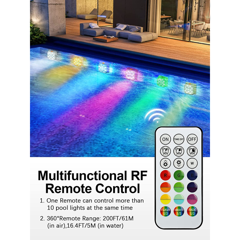 ใ๐๐ฎ๐ฅ๐ญ๐ข๐๐ฎ๐ง๐๐ญ๐ข๐จ๐ง๐๐ฅ ๐๐๐๐ ๐/๐๐๐ ๐๐ ๐๐๐ฆ๐จ๐ญ๐ ๐๐จ๐ง๐ญ๐ซ๐จ๐ฅใ--An RF Remote Control that can control more than 10 pool lights at the same time; With 360ยฐRemote Range of up to 200FT/61M (in the air), and 16.4FT/5M (in water), allowing you to remote control the colors/ lighting modes/ timing/ brightness of the led pool light more convenient.
