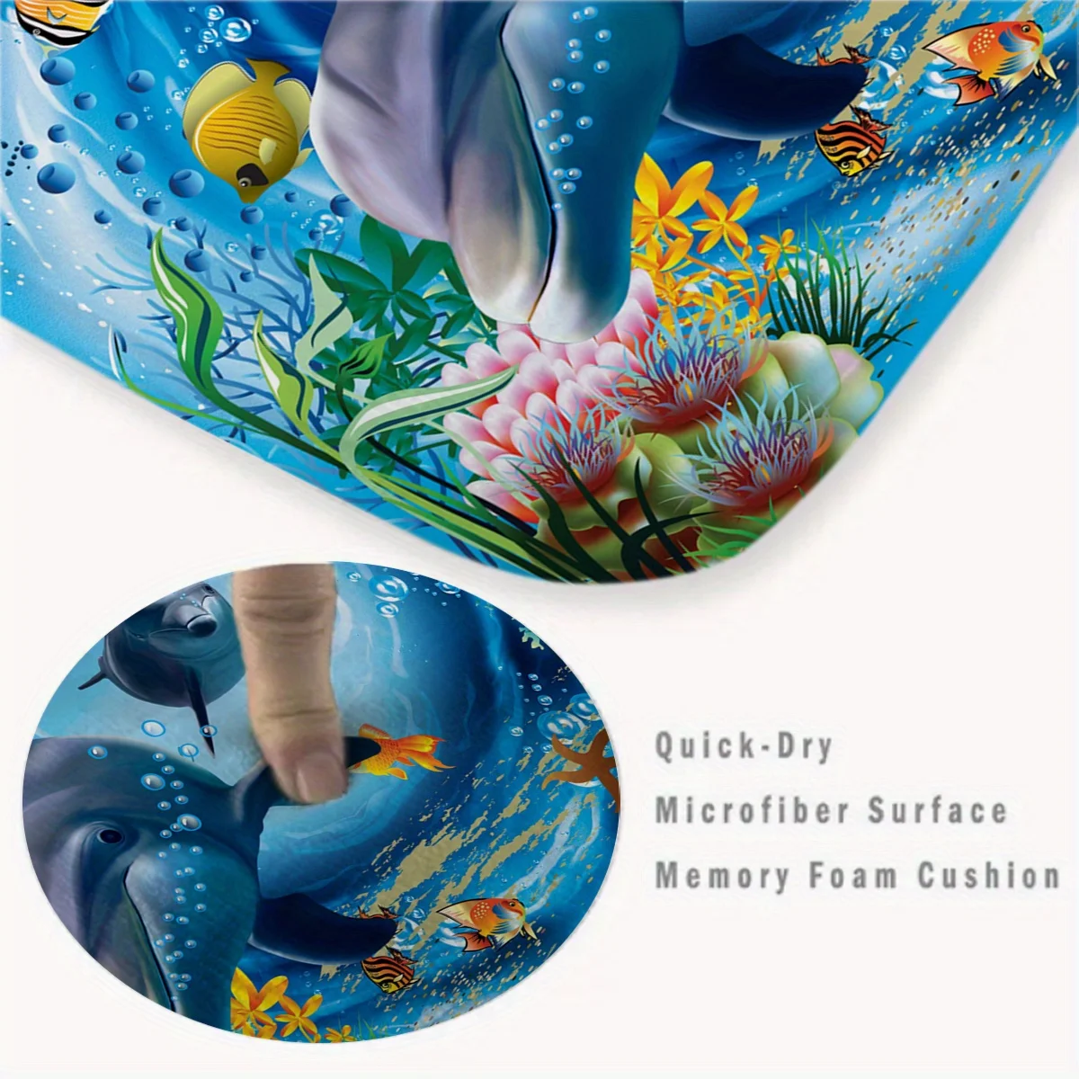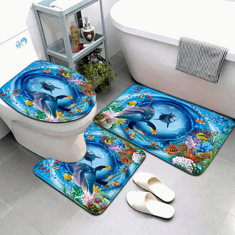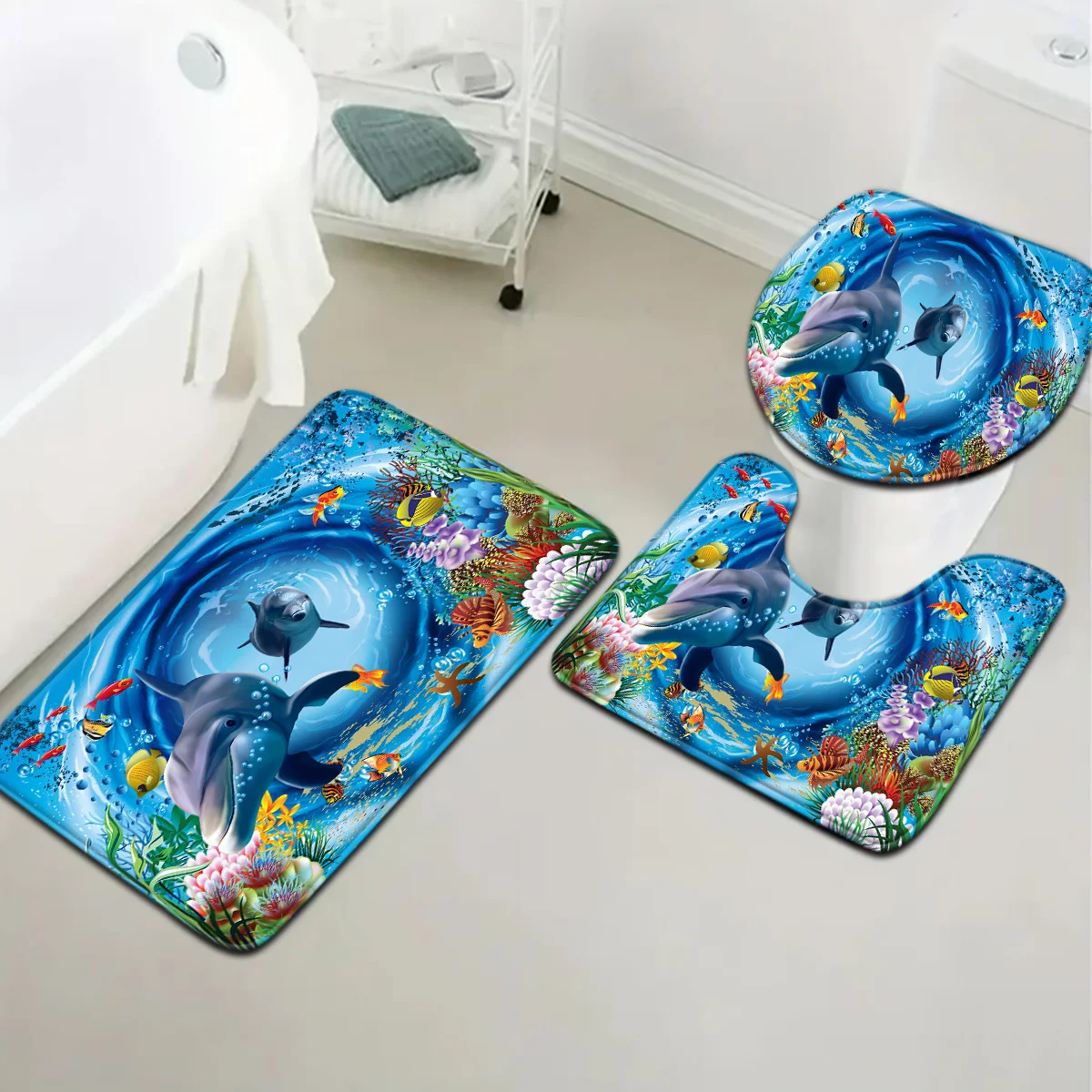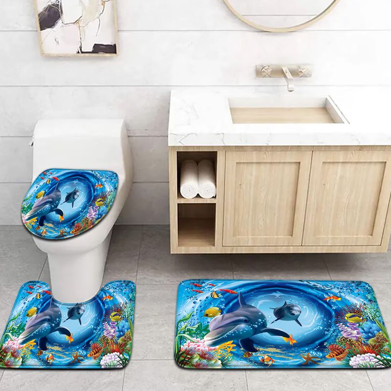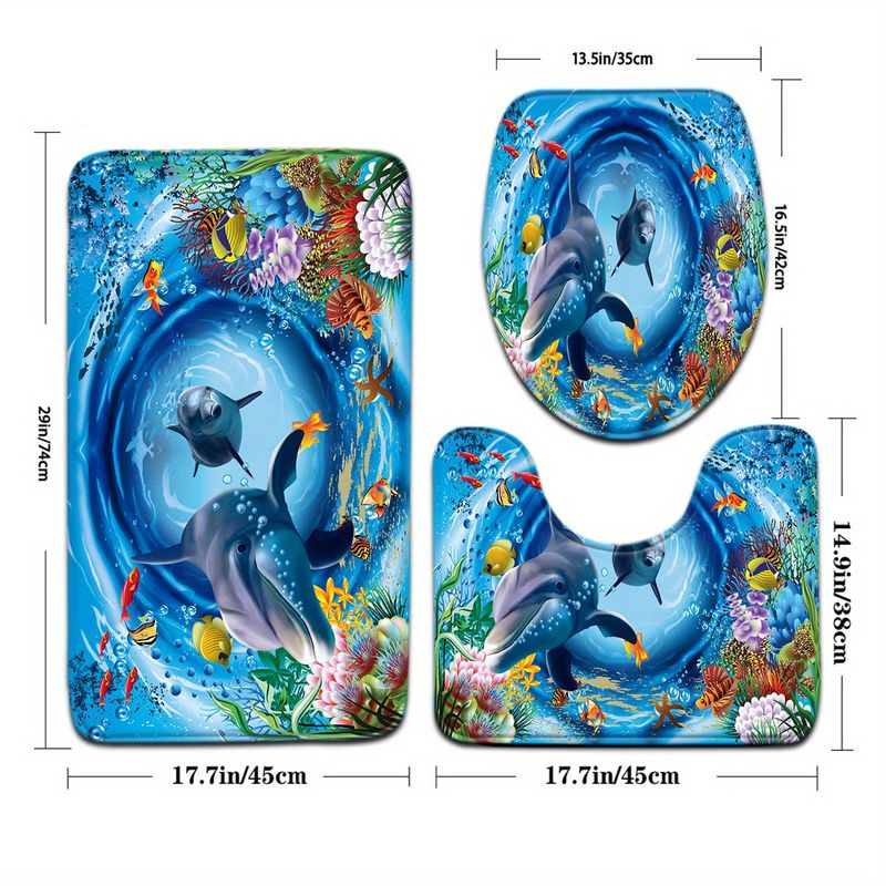 Underwater World Whirlpool Dolphin Bathroom Set - Non Slip Contour Pad, Toilet Lid, and Bath Mat,Suitable for Coastal Home Decor