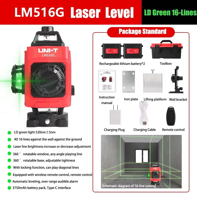 UNI-T 12/16 Lines Laser Level 4D Green 360 Horizontal Vertical Self-Leveling Cross Indoor Outdoor Remote Control Tester LM508G