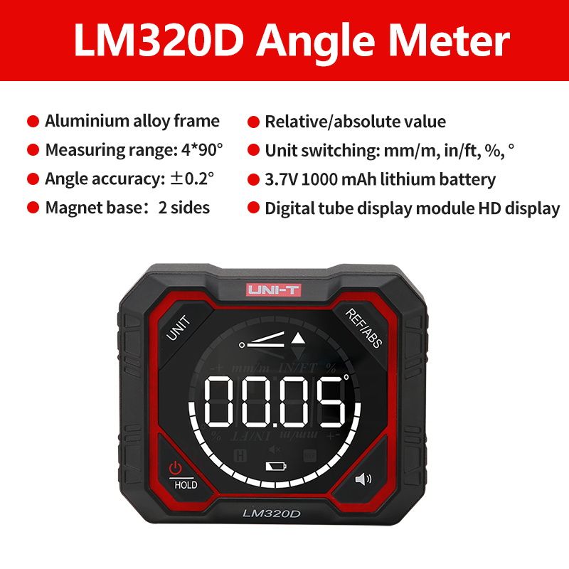 The new LM320 series is a lightweight and portable angle meter with a durable aluminum alloy frame. It features a high-definition color display with automatic screen rotation, supporting a full 4×90° measurement range. The device provides real-time tilt angle data and is equipped with a magnetic base for easy and stable positioning. It is widely used in engineering, construction, and mechanical installation fields.