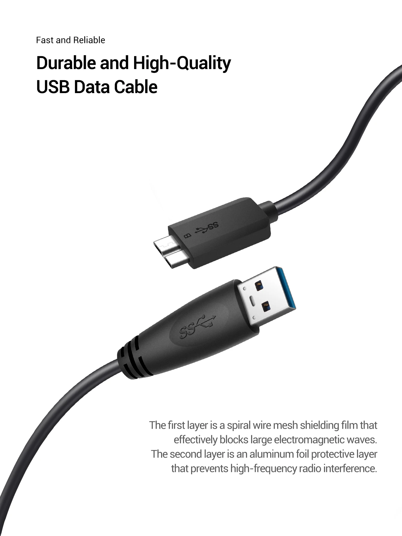 The USB cable features spiral mesh and aluminum foil dual shielding for stable, interference-free transmission.