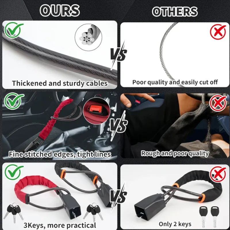 Universal Car Steering Wheel Lock with Seat Belt Buckles with 3 Keys Anti Theft for Vehicles Prevent Theft Durable Security Rope