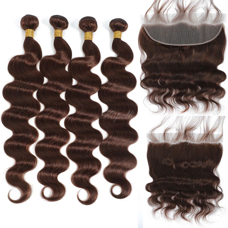 Light Brown Body Wave Bundles with 4x4 HD Transparent Closure Lace Frontal virgin human hair with baby hair, hand-tied swiss lace, match all skin tones, 180% density, no shedding and no tangle; soft and silky, thick and no split ends