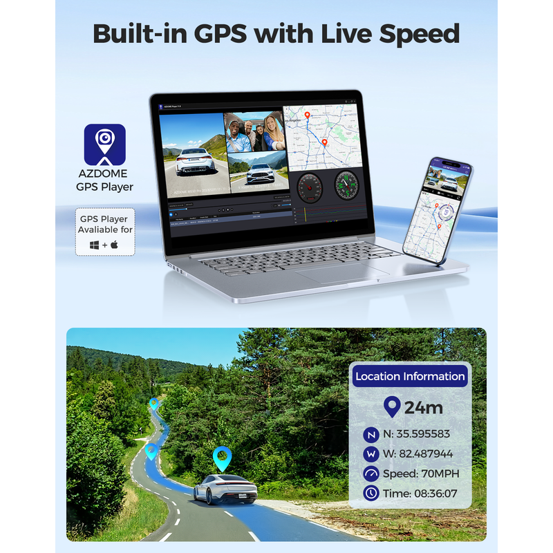 AZDOME GPS Player could view the speed route latitude and longitude of the recorded video. M550 Pro dash camera provides evidence during emergencies. Car camera could completely record the driving route data.
