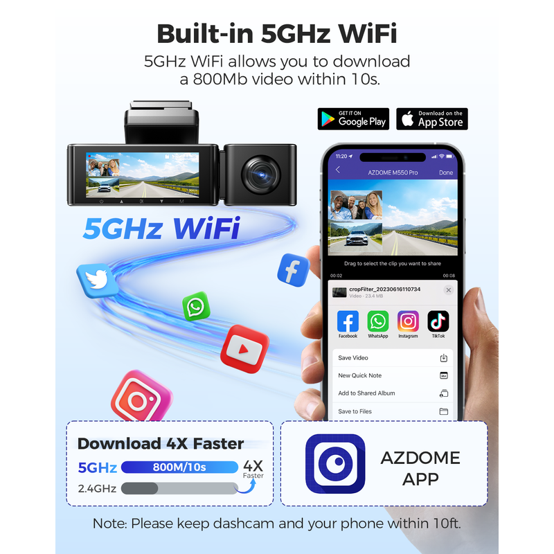 AZDOME M550 Pro dash cam new design with 5GHz WiFi. 5.8GHz transmission speed is 4~6 times that of 2.4GHz. 5.8GHz WiFi allows user to download 800Mb video within 10 seconds.