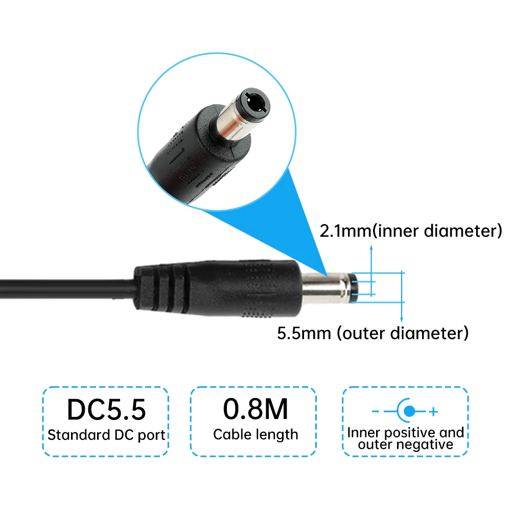 DC5.5mm interface specifications: outer diameter 5.5mm, inner diameter 2.1mm