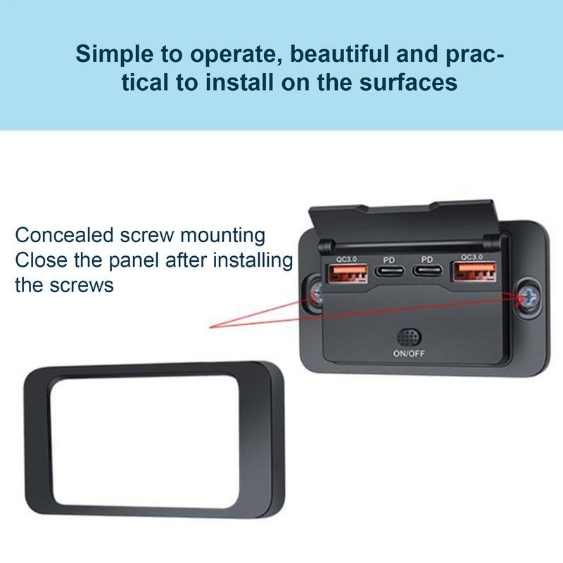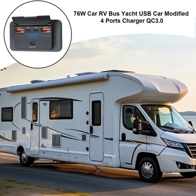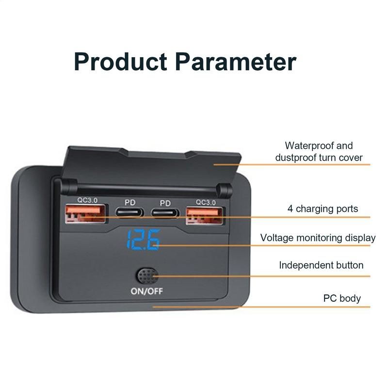 2.Improved Power Efficiency: Featuring double QC3.0 and a double-port PD TYPE-C, this RV USB outlet powers up to 76W, enabling high-speed charging for 4 devices simultaneously, perfectly enhancing charging efficiency with its 4-port design
