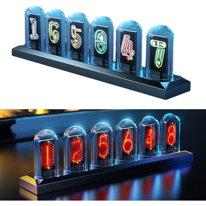 Adopts 6pcs IPS LCD screen to display the time number image with glass cover making it looks like a real vacuum nixie tube clock glowing when power on. The dial supports DIY settings, which can be either a desktop clock or an electronic photo album, which is the best gift for your friends and family on birthday, Christmas and New Year