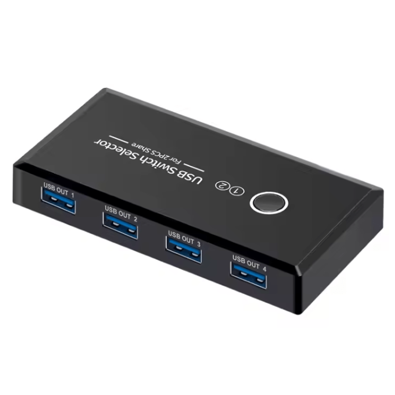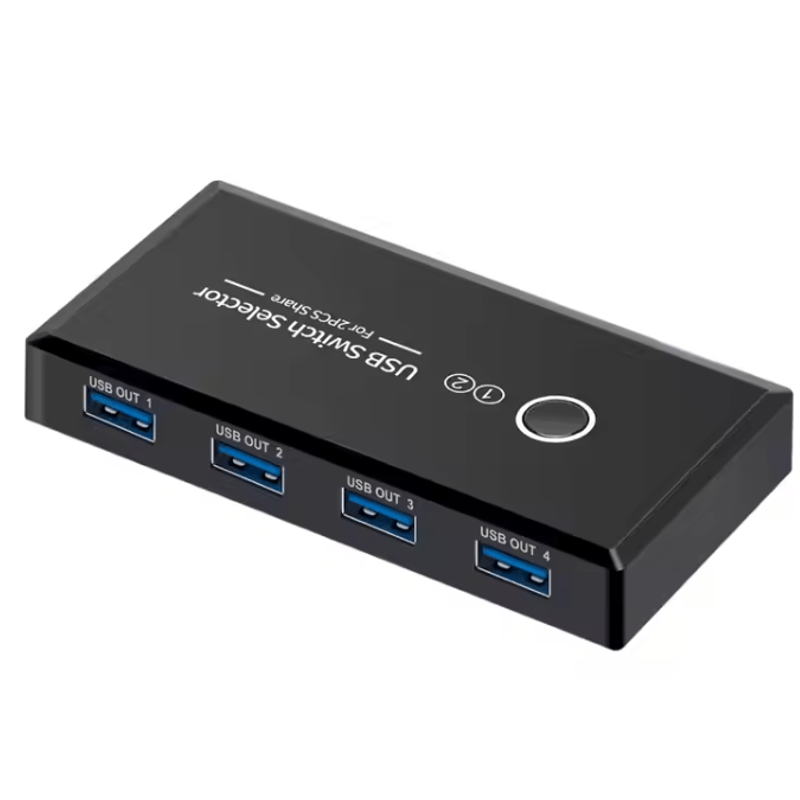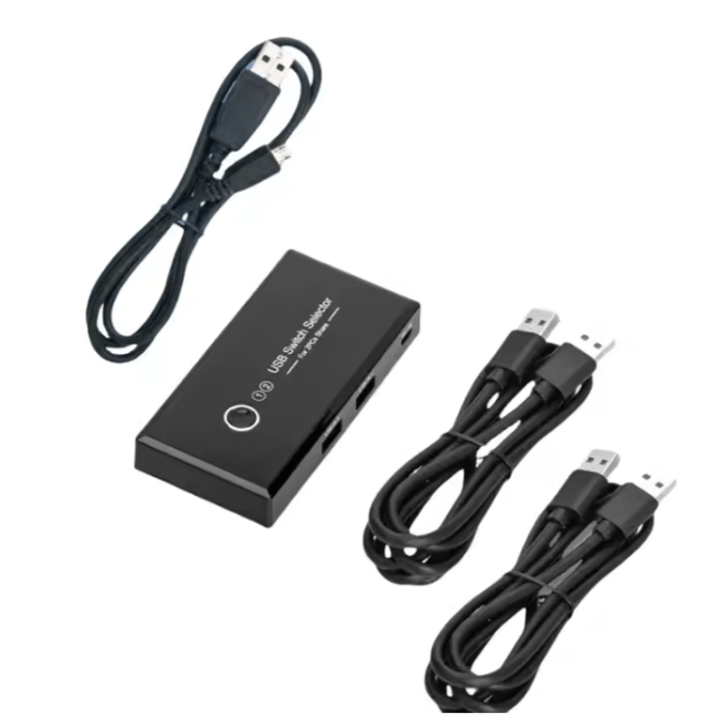 A compact, plug‑and‑play USB switch that lets two PCs share up to four USB peripherals without constant plugging and unplugging. Simply connect each computer to one of the two “USB IN” ports, plug your keyboard, mouse, printer, scanner or U‑disk into the device side, and press the top button to toggle which PC has control. Built‑in LEDs clearly indicate the active host, and included 1.5 m cables make setup a breeze.