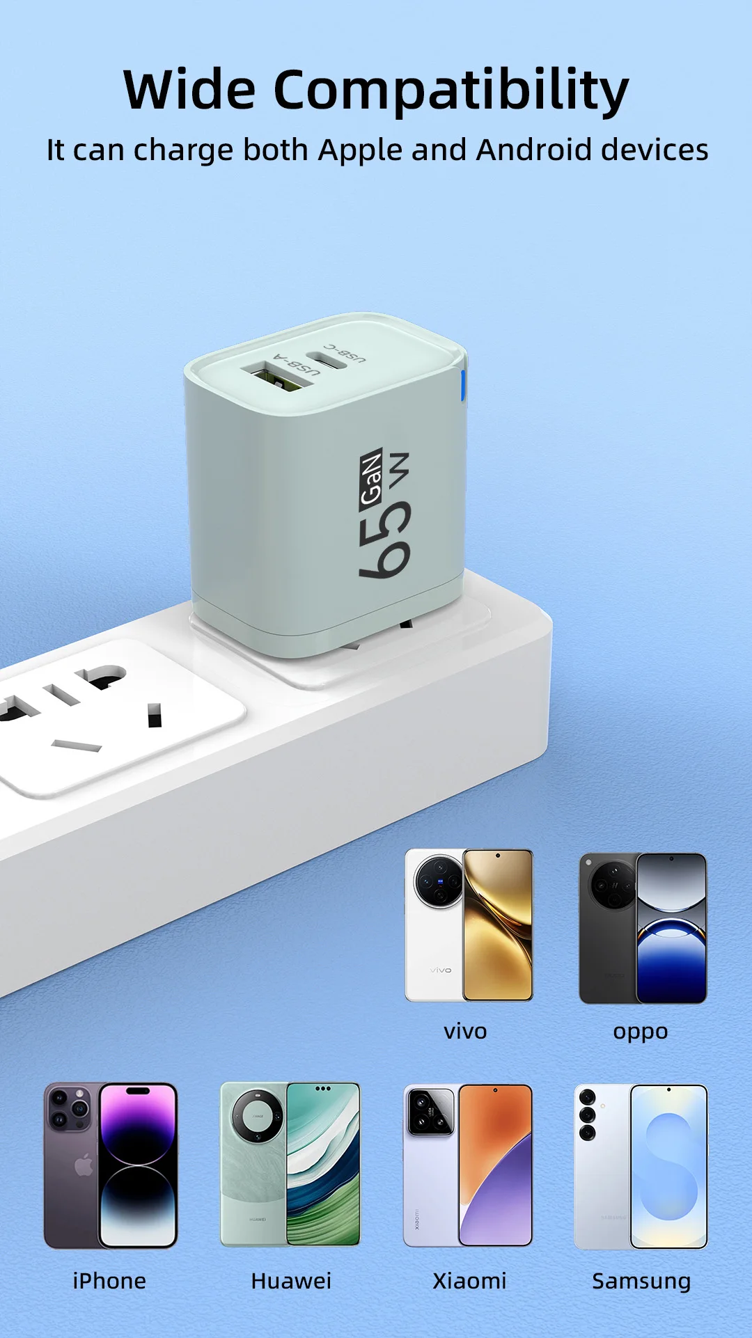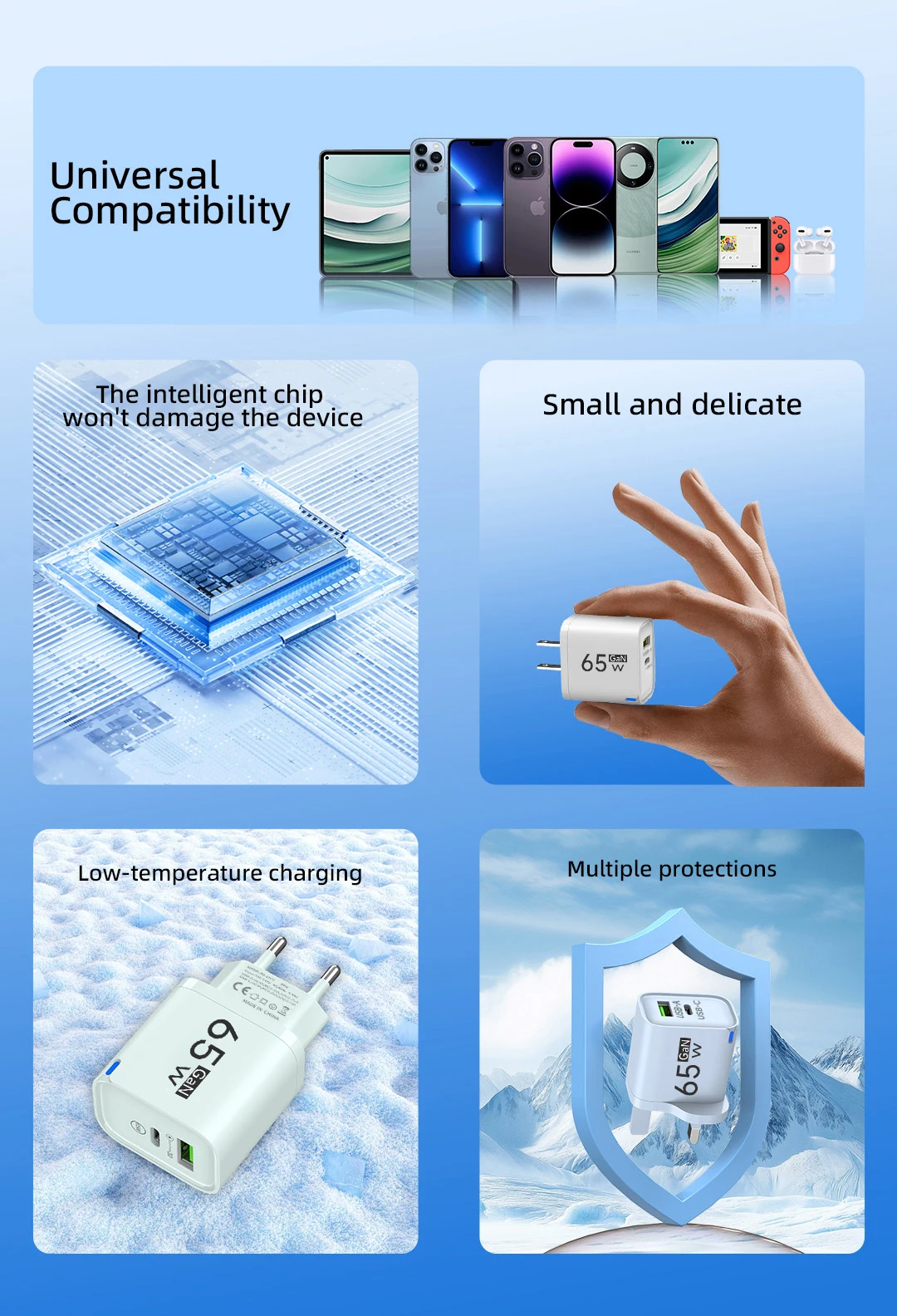 65W Ultra-Fast Charging: Power your devices with GaN technology, compatible with PD and QC protocols for optimal speed.