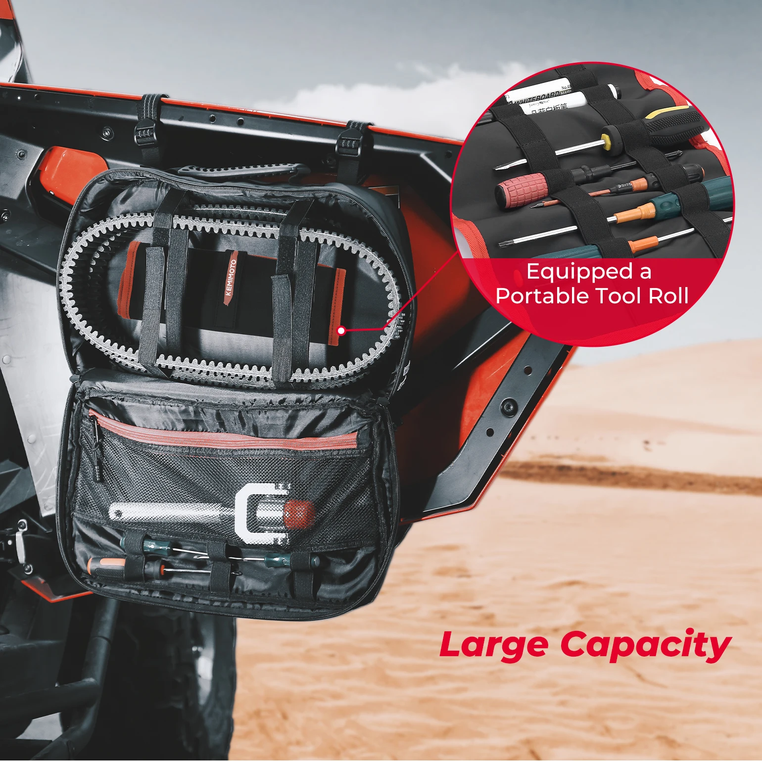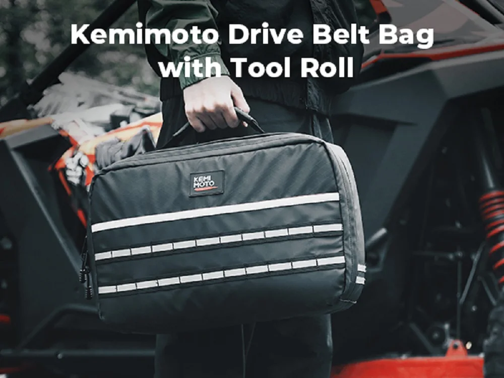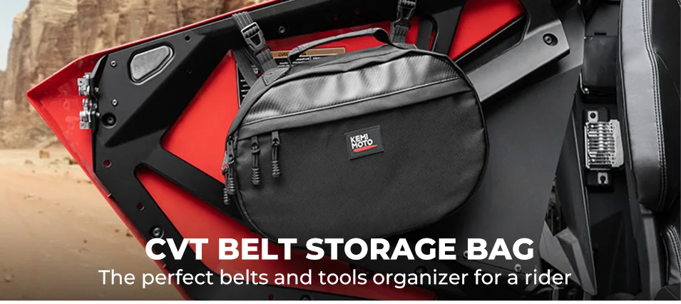 Kemimoto Clutch Belt Bag fits UTV, ATV, and other models, and can be mounted on the roll bar, back of the seat, bracket, door, bumper, rooftop, and other places.