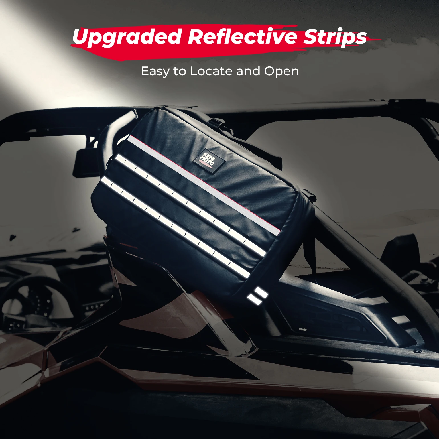 UTV Drive Belt Bag has reflective strips on the front and sides, making it easier to locate the bag and find zippers to open it in the dark.