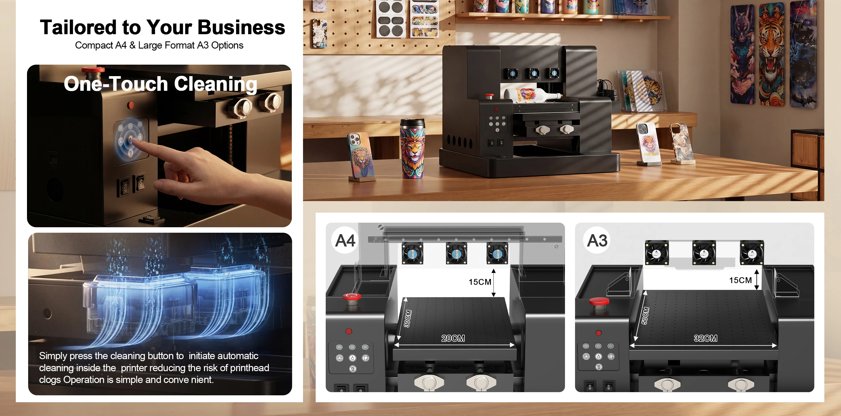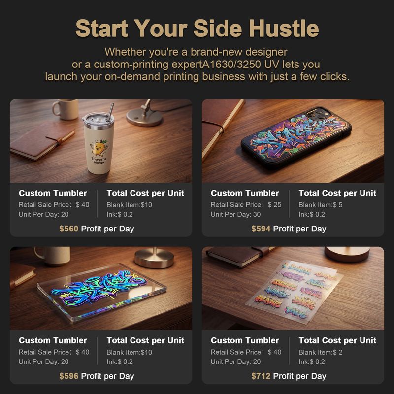 Whether you're a brand-new designer or a custom-printing expert, A1630/3250 UV lets you launch your on-demand printing business with just a few clicks.