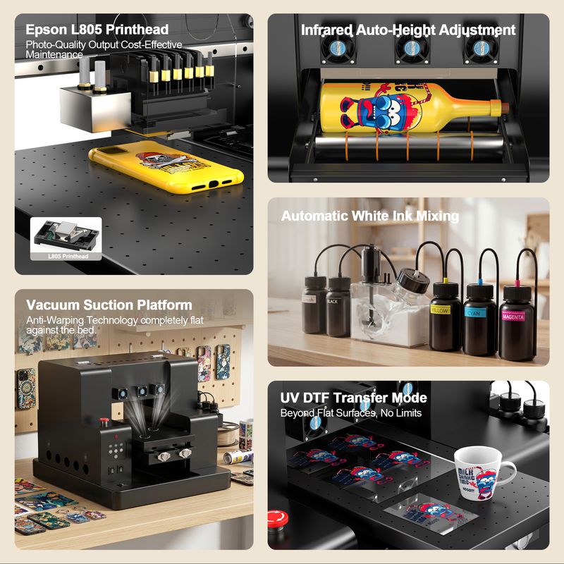 Print directly on phone cases, wood, acrylic, and metal. Compatible with 400+ rigid materials.