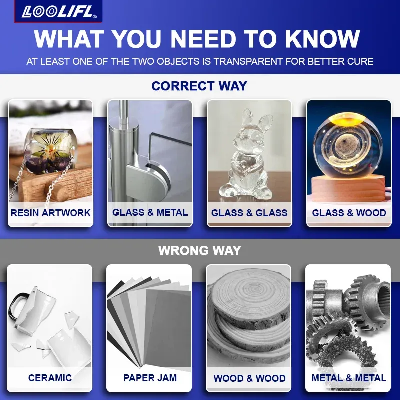 * Bonded UV Resin Kit Cured in 5-10 Seconds: LOOLIFL UV resin for bonding has low viscosity(refer to fluency), strong adhesive, UV curable, odorless&high transparency after curing. Compared with other UV resin, it cures rapidly under the irradiation of a UV flashlight.