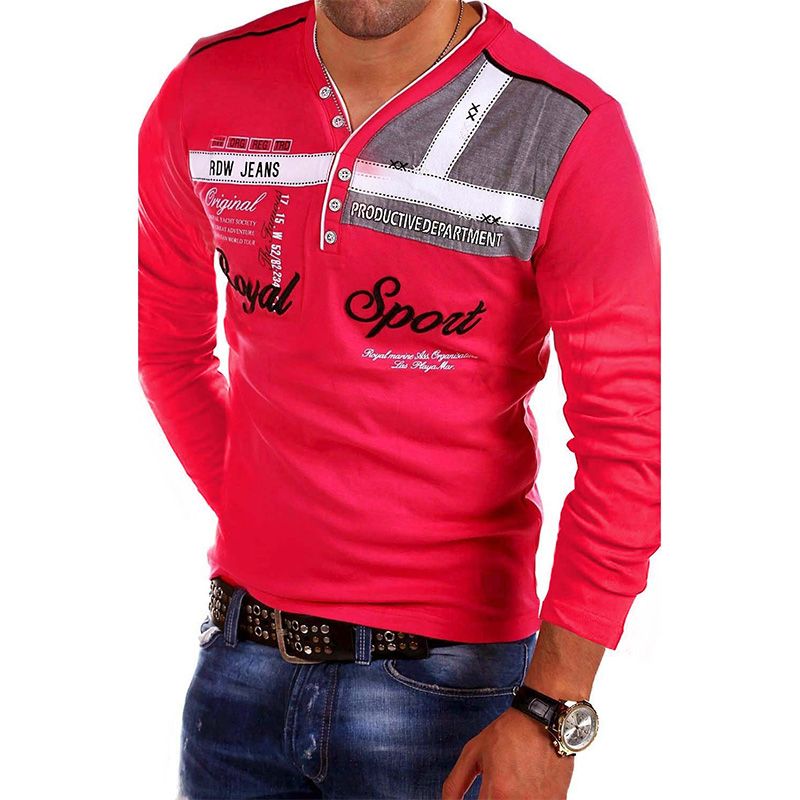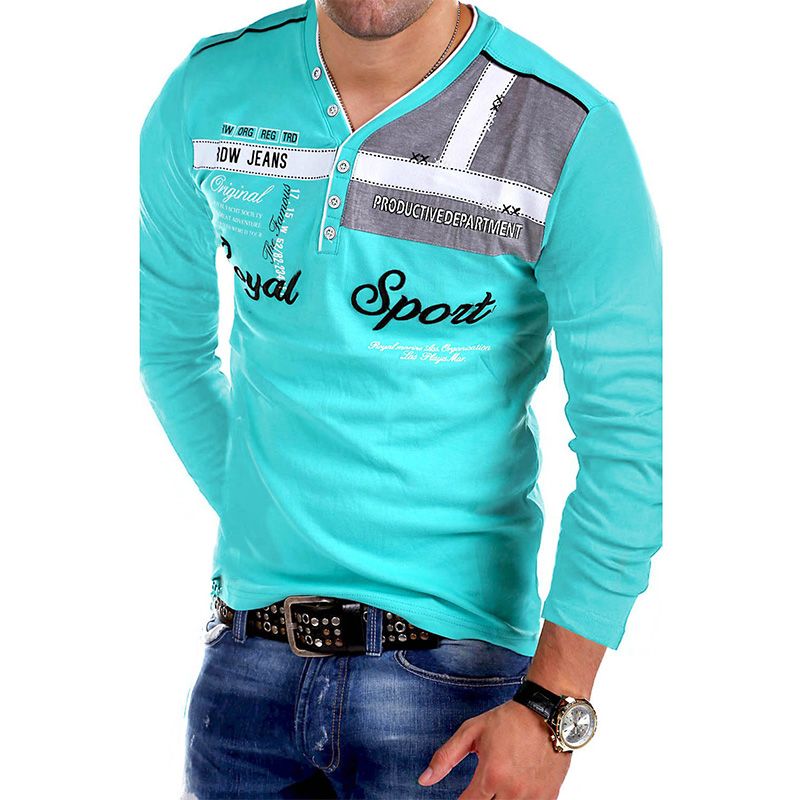 V-Neck Polo Shirt Letter Printing Long-Sleeved T-Shirt Men Royal Blue L