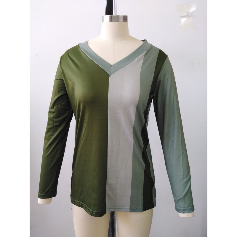 V-neck Striped Printed Long Sleeves T-shirt Green 5XL