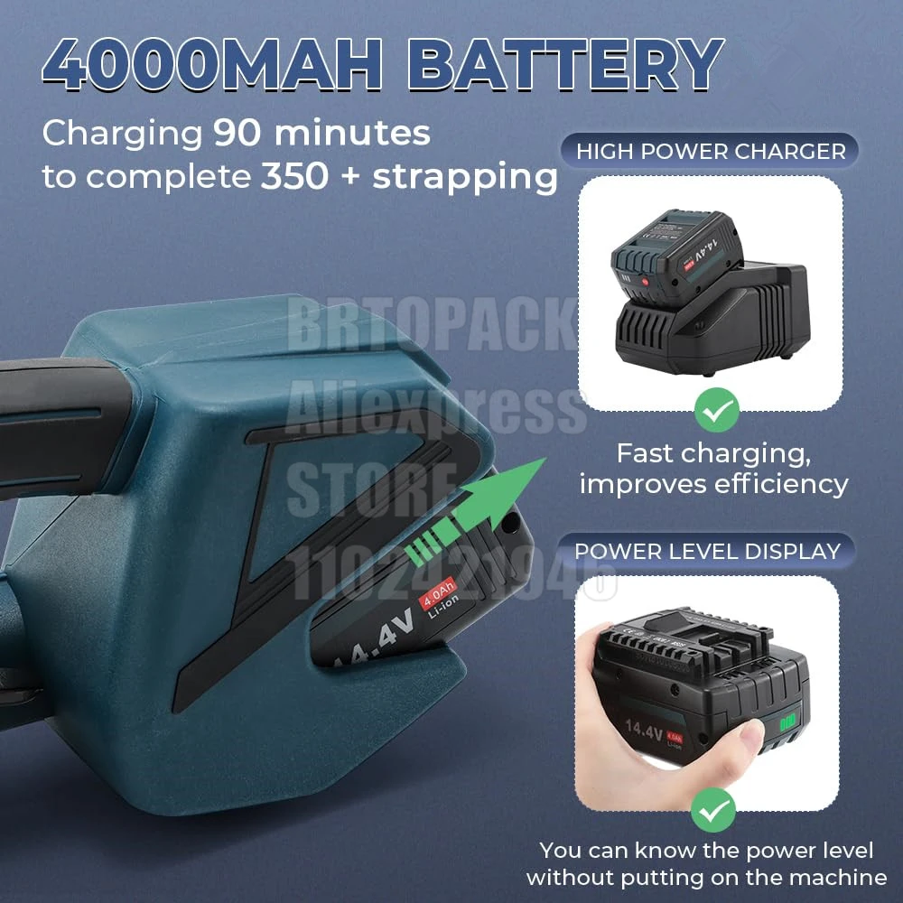 * Large Capacity Lithium Battery, Safe & Durable. Charging and storing electricity, charging 90 minutes, it can pack 200-300 packing belts.