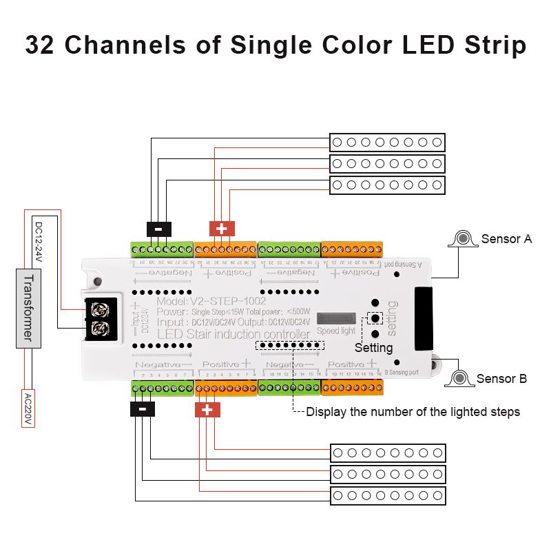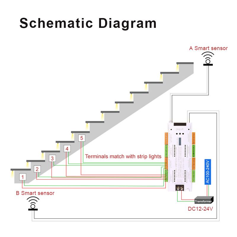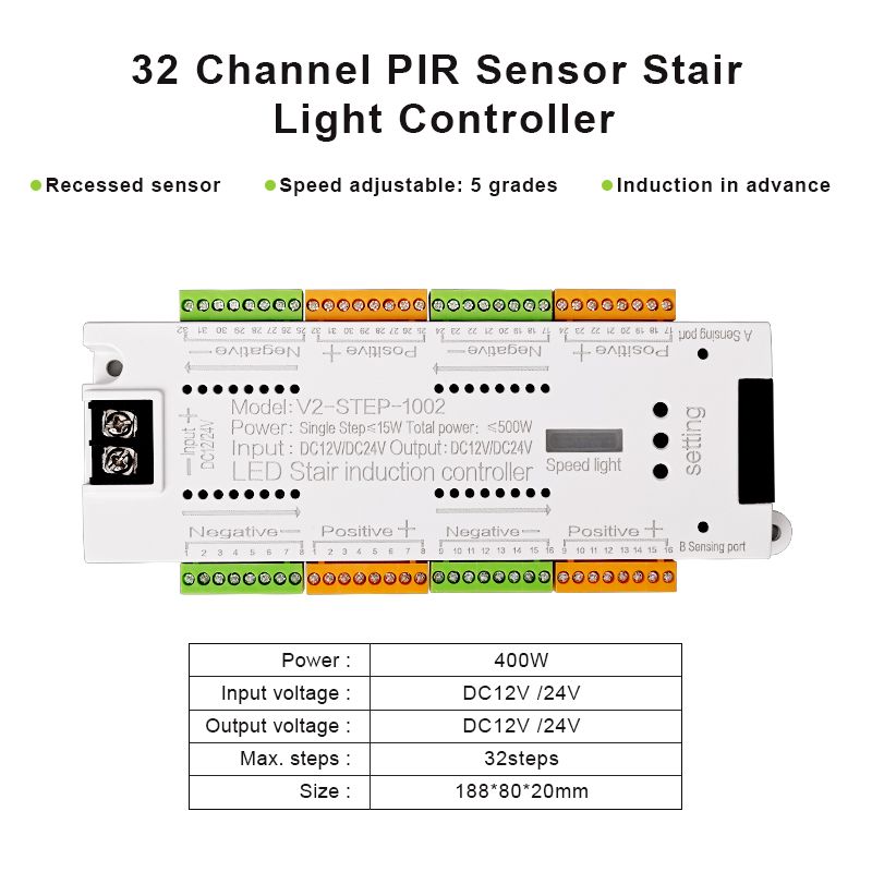 V2 Stair LED Light Controller DC 12V 24V 32 Channels Indoor Stairs PIR Sensor Dimmer Controller For Stairway Staircase Lighting