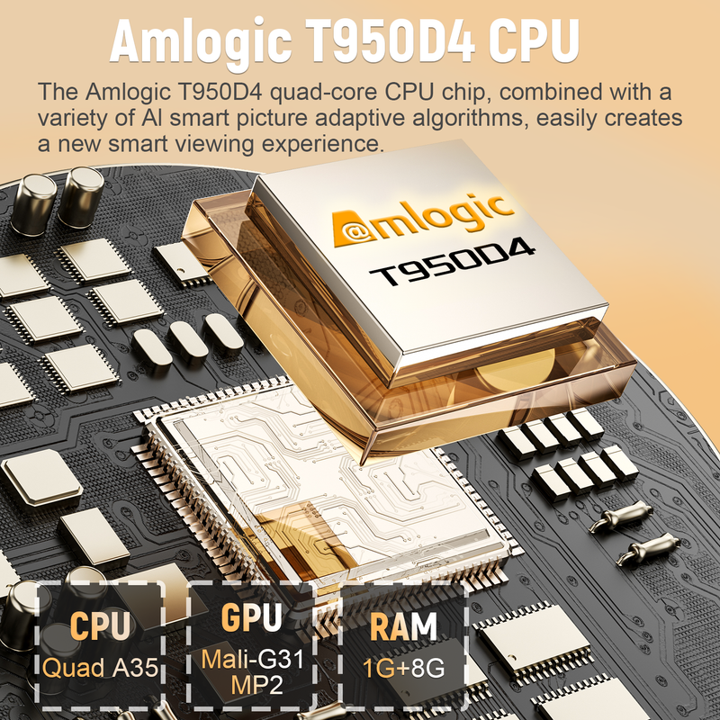 The Amlogic T950D4 quad-core CPU chip, combined with avariety of Al smart picture adaptive algorithms, easily createsa new smart viewing experience.