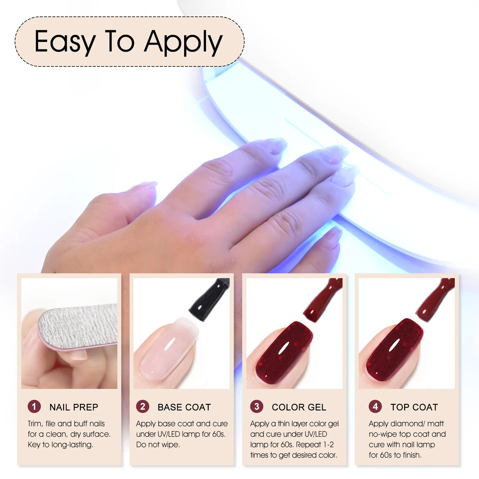 3.Apply Base Gel: Evenly apply a layer of base gel. The base gel can effectively enhance the adhesion of the nail polish to the nails and significantly extend the durability of the nail polish. After application, cure it with a UV lamp or LED lamp for 60 - 90 seconds.