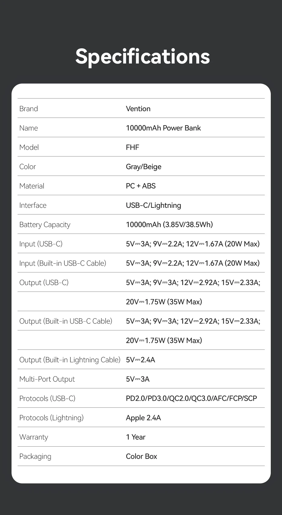Output (Built-in USB-C Cable): 5V⎓3A; 9V⎓3A; 12V⎓2.5A; 15V⎓2.33A (35W Max)