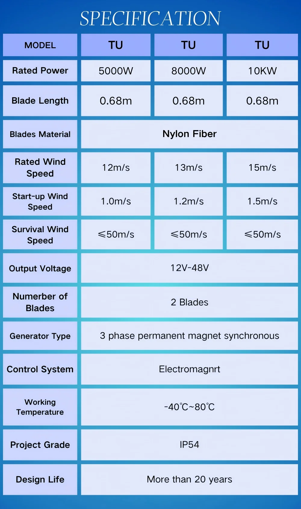 4.Blades using new art of precision injection molding,matched with optimized aerodynamic shape and structure which enhance the wind energy utilization and annual output.