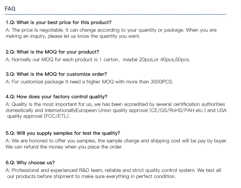 Quality is the most important thing to us, we have obtained quality certifications (CE/GS/RoHS/FCC etc.) from several certification bodies inside and outside China.