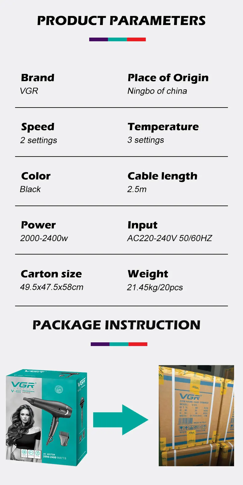 β€β€β€β€β€ β€ This is the genuine VGR brand hair drying care set. It features powerful performance, outstanding appearance, safe and reliable design, comfortable user experience, and excellent cost performance. It enjoys high popularity and a good reputation worldwide. This is the VGR 450